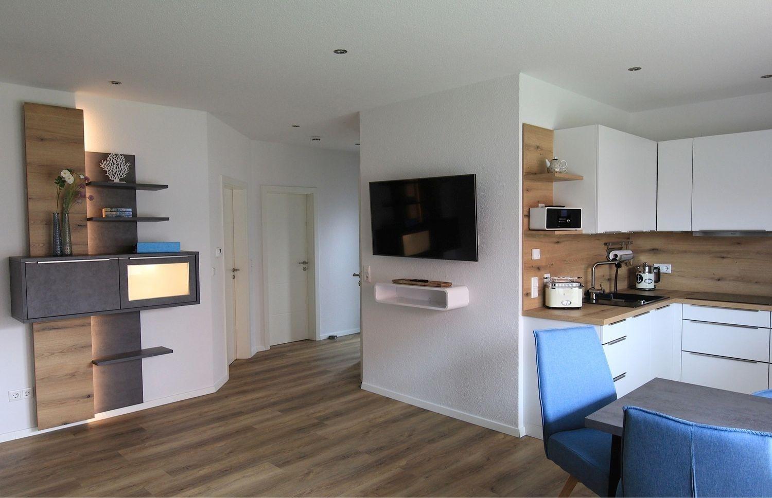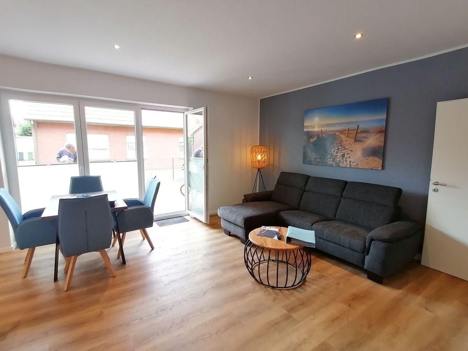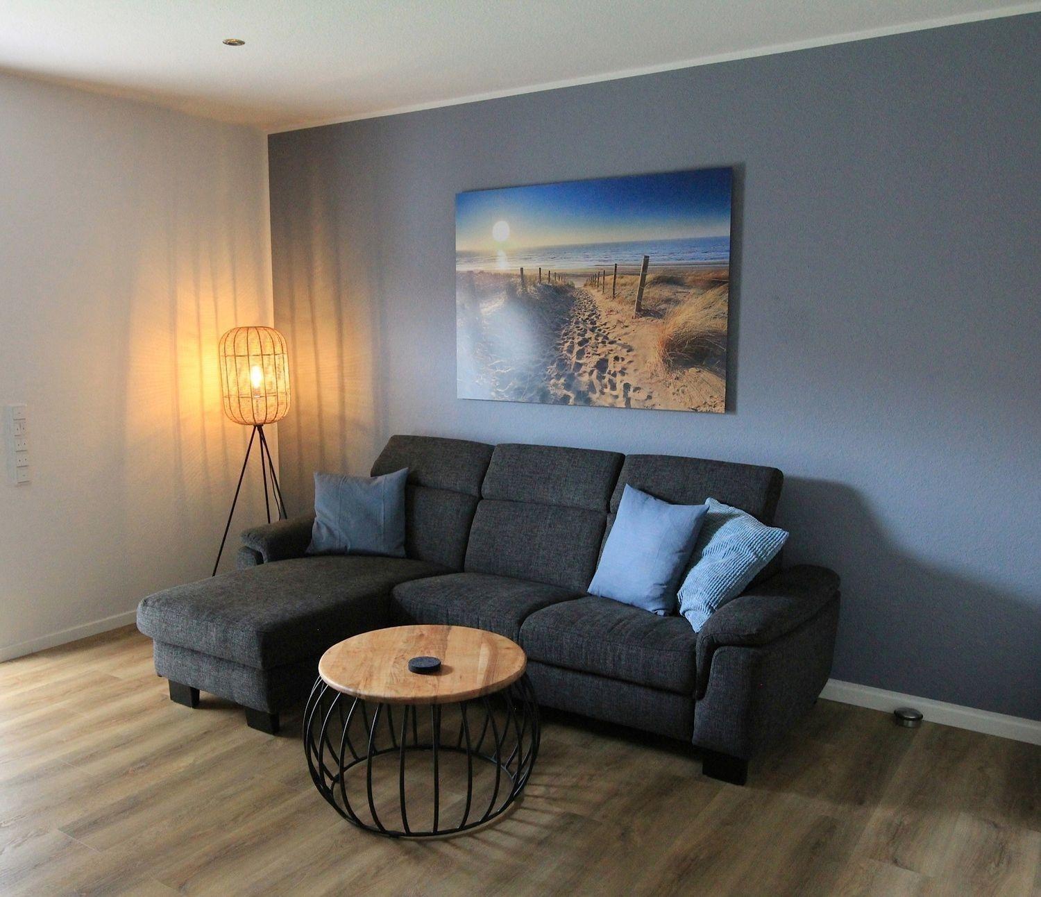 Die maritim und modern eingerichtete Wohnung befindet sich im Erdgeschoss und hat eine Größe von 54 qm.