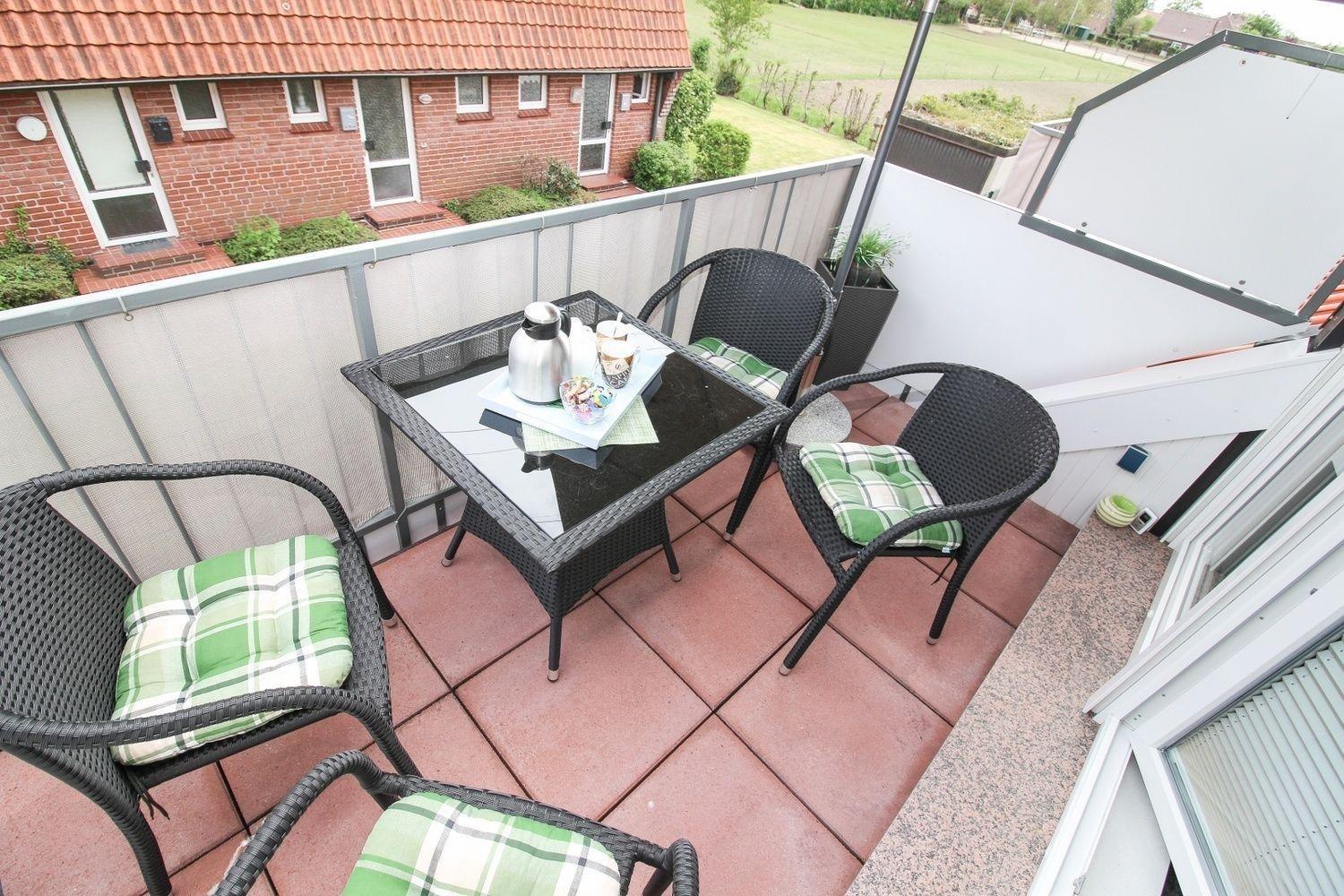 Vom Balkon mit Windschutz und Gartenmöbeln in Rattan Optik sowie Sonnenschirm, haben sie einen schönen Blick ins Grüne.