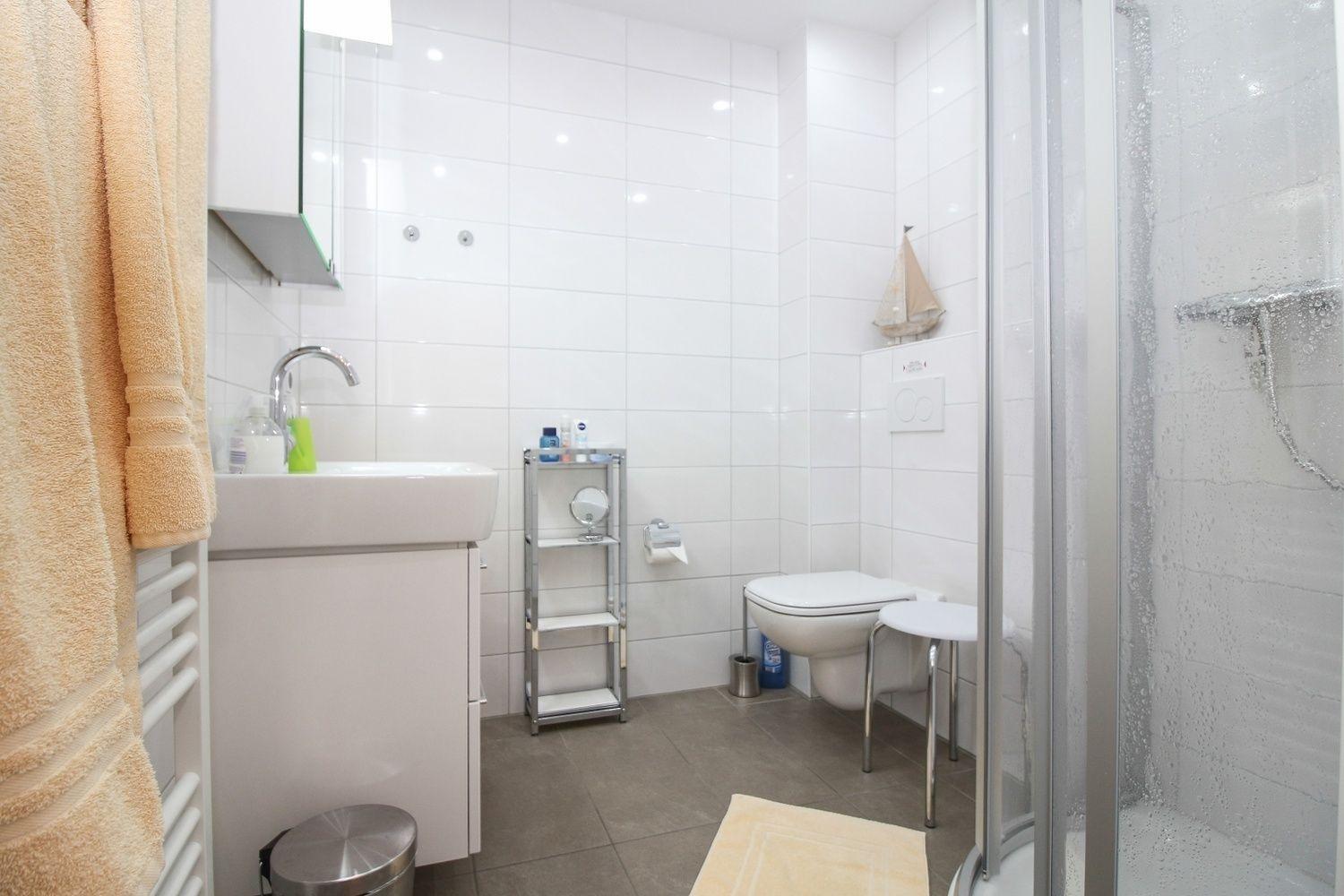 Das moderne Bad mit Dusche, WC, Waschbecken, Handtuchwärmer, Fön, Radio, Duschhocker, Kinderhocker und Fußbodenerwärmung wurde ebenfalls in warmen Naturtönen gehalten.