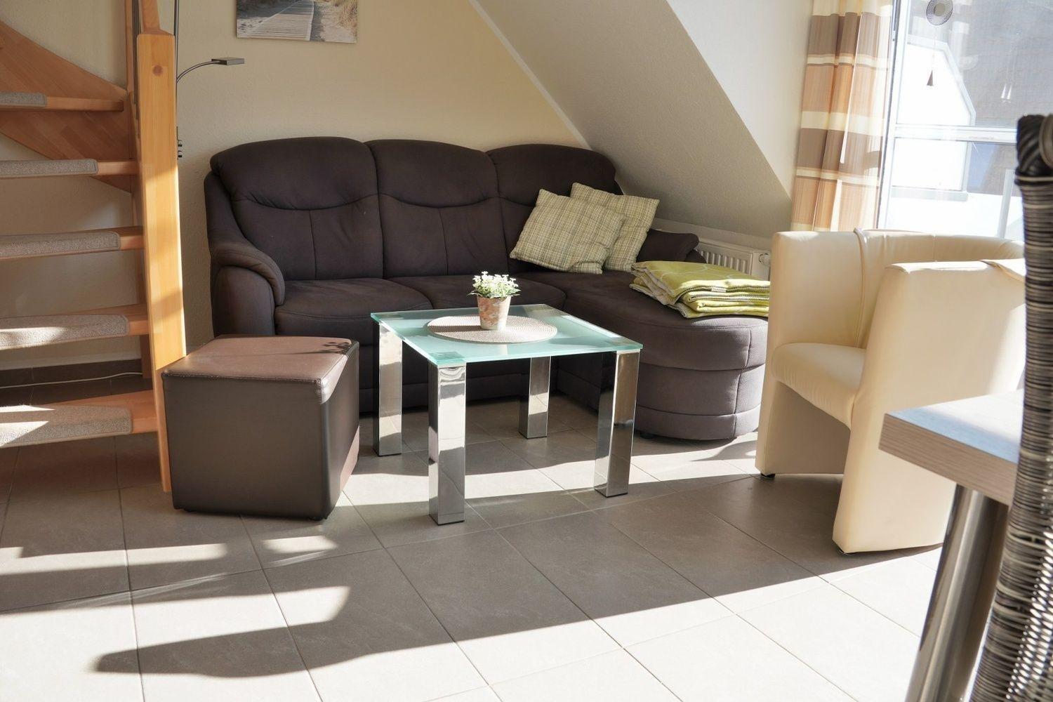 Auf ca. 62 qm können Sie hier Ihren Urlaub mit bis zu vier Personen geniessen. Im Wohnbereichauf auf einem braunen Sofa mit Ottomane, Leselampe, Sessel mit Hocker sowie Couchtisch können Sie es sich gemütlich machen.