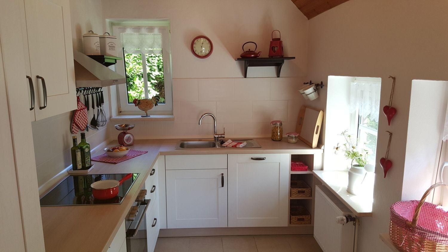 Die Landhausküche verfügt über einen Herd mit Cerankochfeld, Backofen, Spülmaschine, Kühlschrank, Toaster, Kaffeemaschine, Wasserkocher, Mixer, ausreichend Geschirr und alle notwendigen Küchenutensilien.