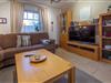 Der Wohnbereich ist großzügig gestaltet und umfasst eine bequeme Sitzgruppe, einen großen Flachbildfernseher und eine integrierte Küchenzeile mit Essbereich. Die Küche ist gut ausgestattet mit Ceranherd, Kühlschrank, Gefrierfach, Mikrowelle, Spülmaschine und weiteren nützlichen Geräten. Das Badezimmer bietet eine Dusche, Waschbecken und WC. Im Dachgeschoss befindet sich eine Sauna aus Edelhölzern, eine zusätzliche Dusche, eine Sitzgruppe und zwei komfortable Einzelbetten.