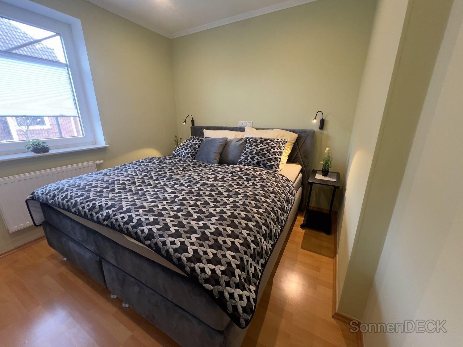Im ersten Schlafzimmer befinden sich ein hochwertiges 1,80x2,00-m-Box-Springbett mit 2 Leselampen; Panasonic TV-Flachbildschirm 40“; Kommode mit 4 Schubladen; freistehende Kleiderstange mit Bügeln; Plissee; Außenrollladen; Fliegengitter, Fußbodenheizung; 1,35x2,00-m-Vierjahreszeiten-Bettdecken und 80x80cm-Kopfkissen aus Faser-Technologie