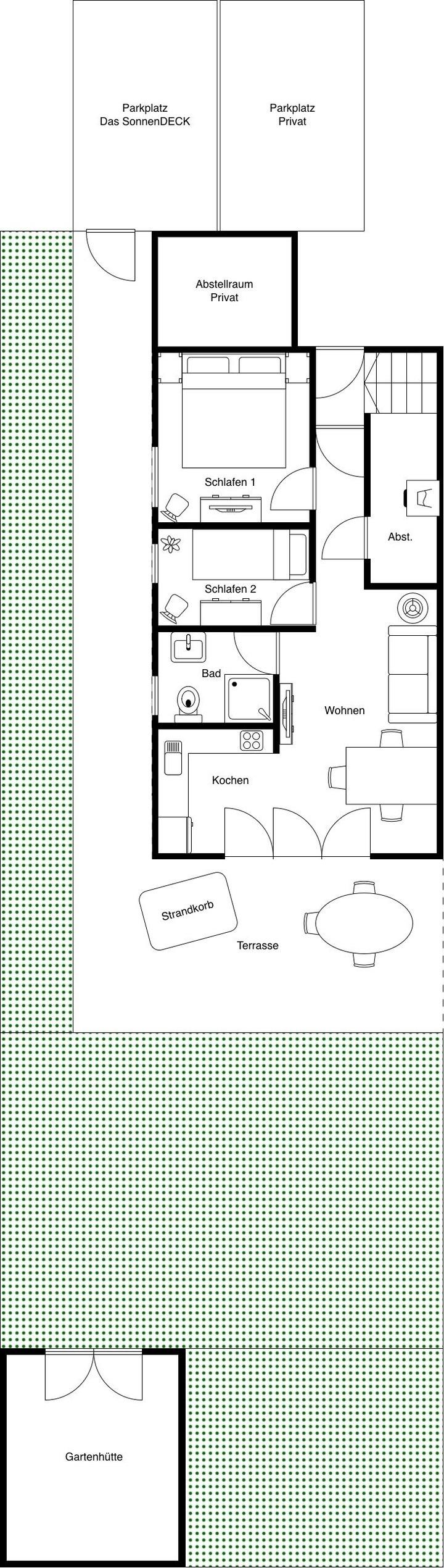 Die Terrasse ist mit einem hochwertigem Strandkorb; runden Gartentisch (115 cm Durchmesser); 3 Gartenstühlen mit Auflagen; 2 klappbare Gartenliegen und einem großen Sonnenschirm ausgestattet