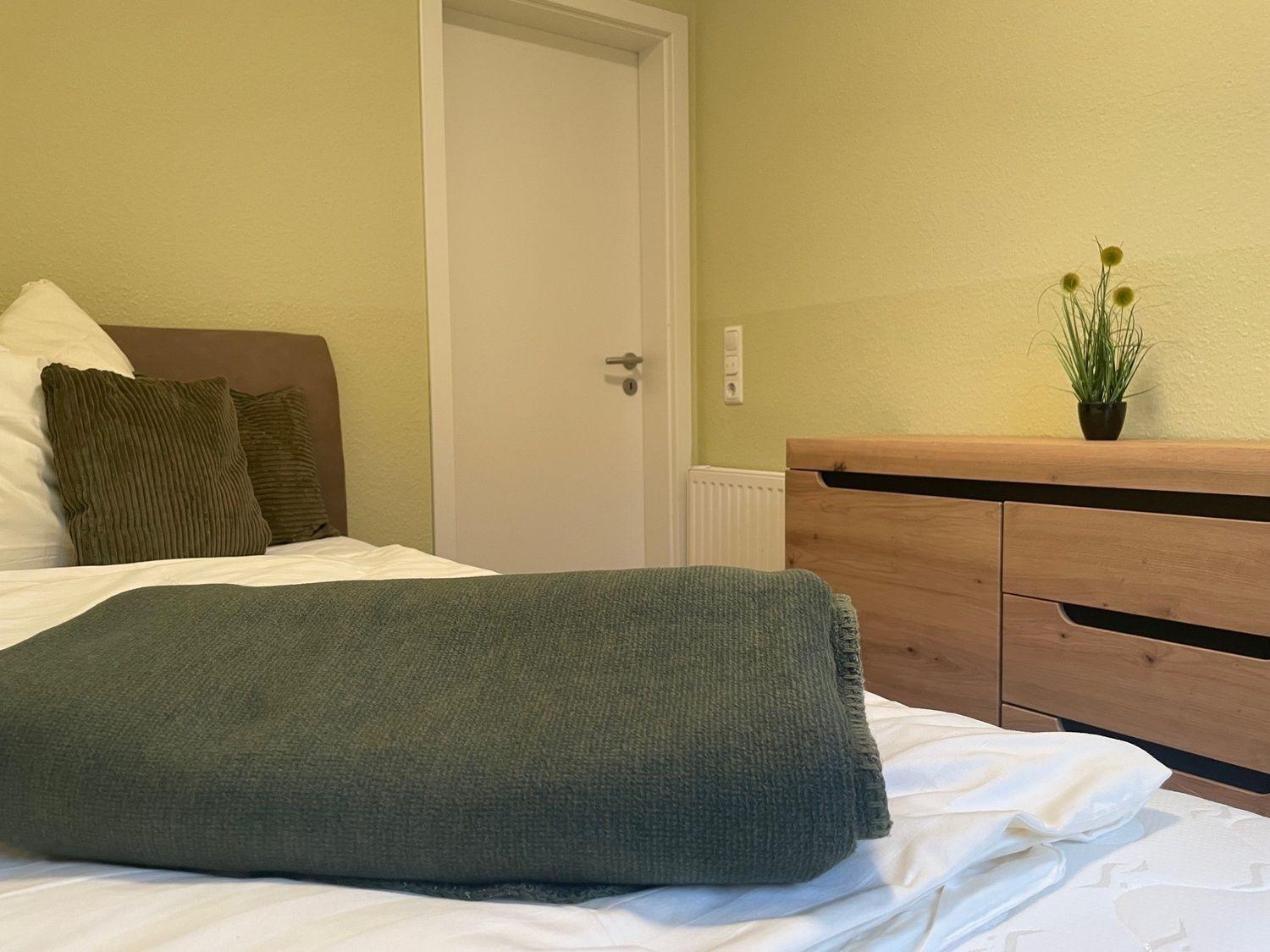 Hochwertiges Box-Springbett mit 2 Leselampen; Panasonic TV-Flachbildschirm 40“; Kommode ; freistehende Kleiderstange mit Bügeln; Plissee