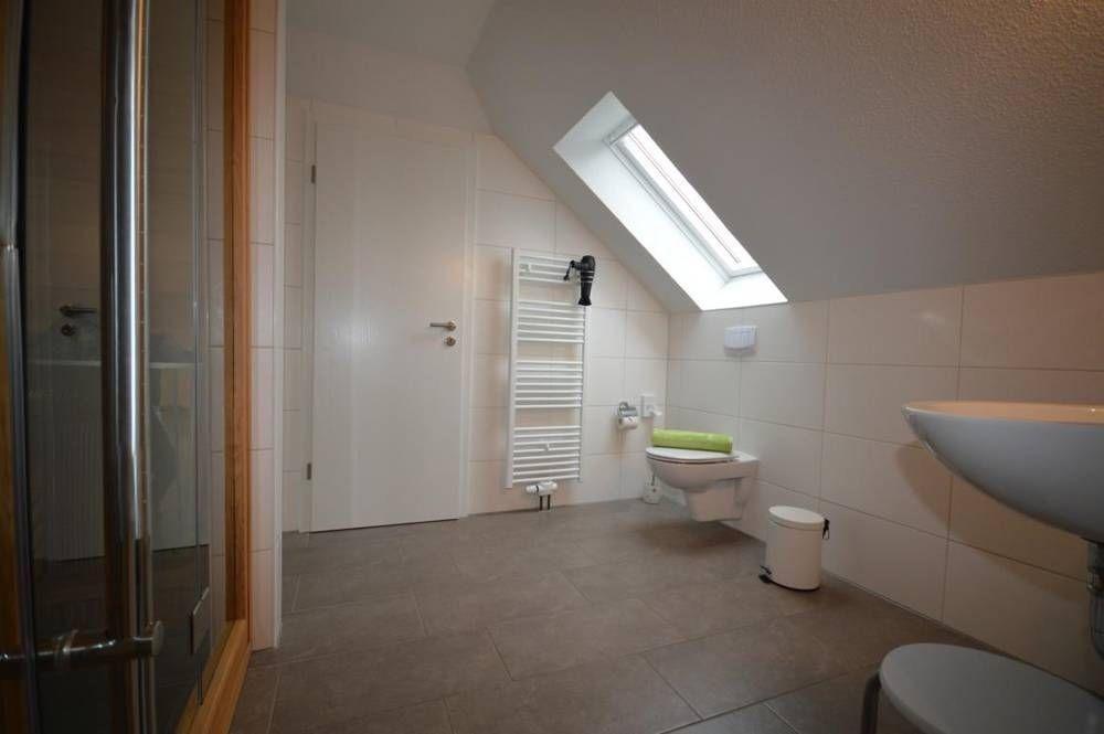 Tageslichtbad mit WC, ein Urinal, eine ebenerdige Dusche mit Echtglastüren sowie ein Handtuchheizkörper und Föhn.