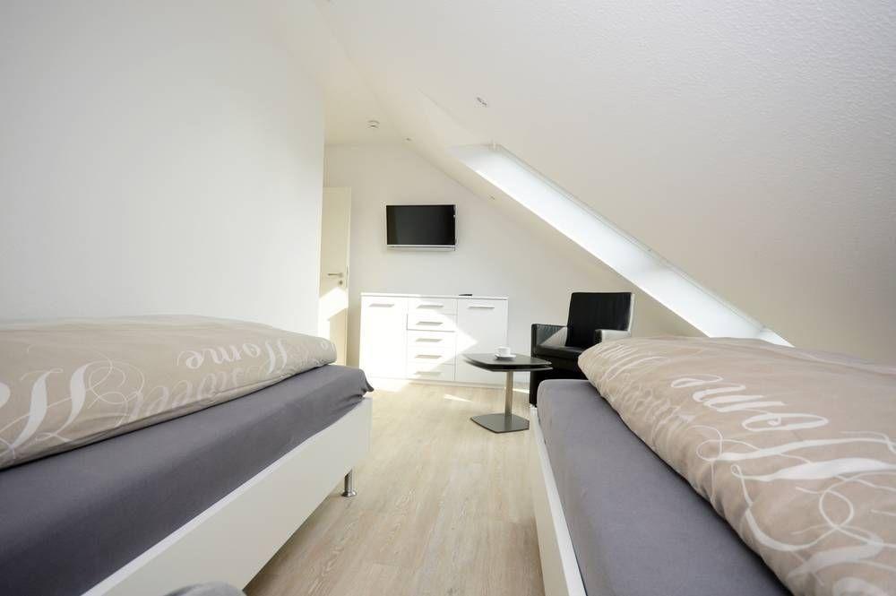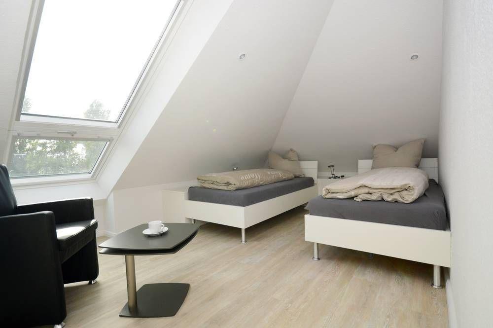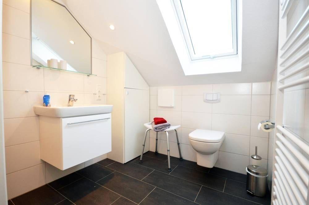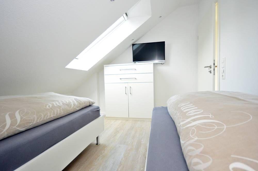 Im Obergeschoss finden Sie zwei Schlafzimmer mit je zwei Einzelbetten und auf Wunsch ein Kinderreisebett vor. Auch hier befindet sich ein Flachbildfernseher. Eine Kommode liefert zusätzlich Stauraum. Im angrenzenden Badezimmer ist ein WC, Waschbecken und Duschbereich untergebracht mit Handtuchheizung.