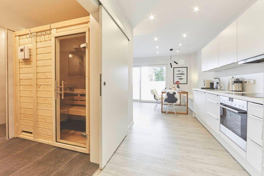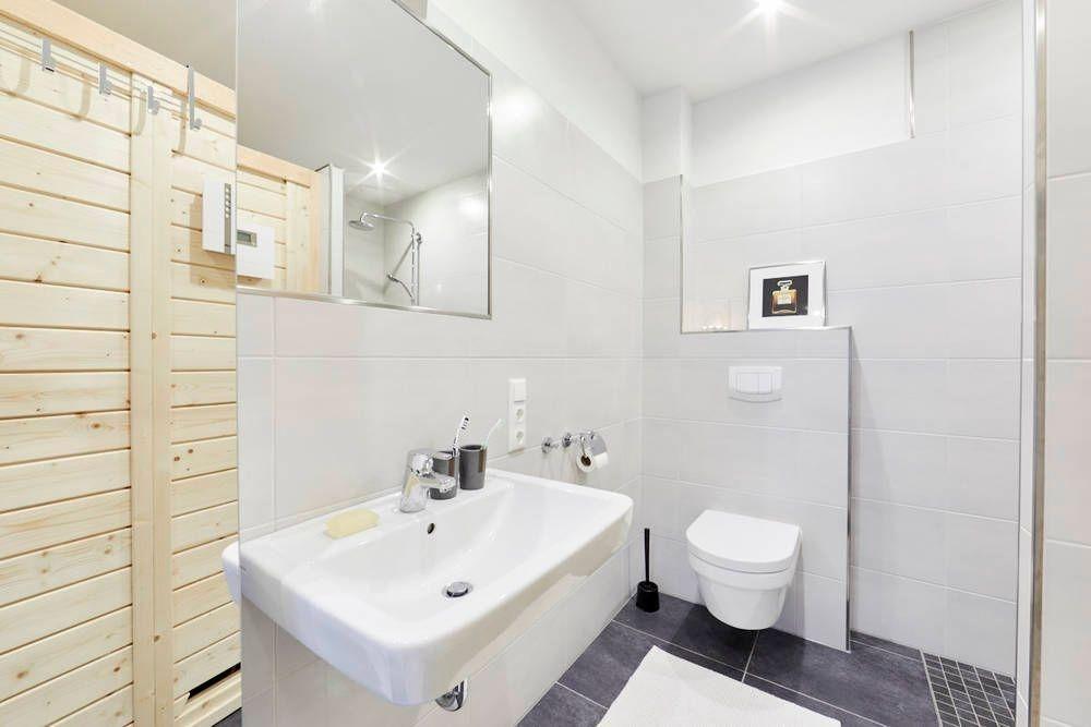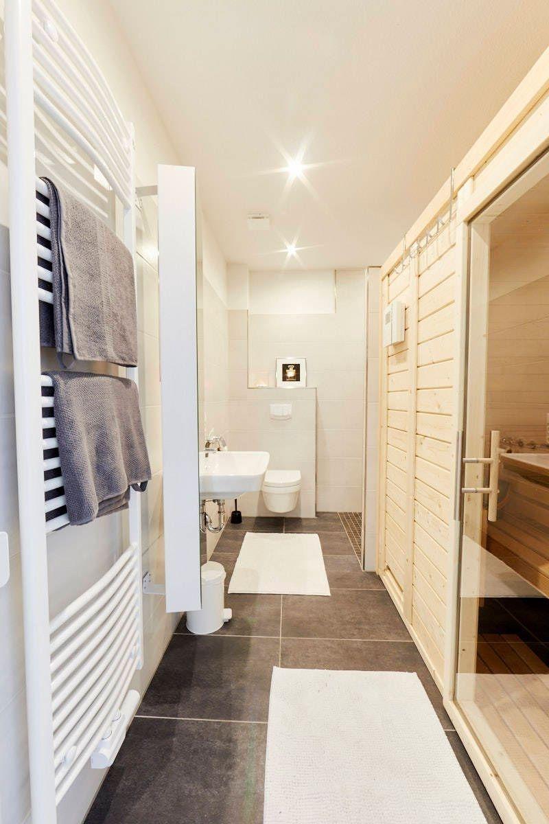 Das großzügige Bad im Erdgeschoss ist mit einer finnischen Sauna (1,80 m x 1,20 m), einer bodentiefen Rainshower-Dusche sowie einem Handtuchwärmer ausgestattet und lädt Sie durch und durch zum Relaxen nach einem langen Spaziergang ein.