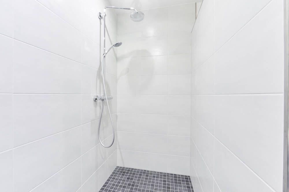 Das helle Tageslicht-Badezimmer im Obergeschoss ist hochwertig ausgestattet und bietet neben einem Handtuchwärmer und einem praktischen Drehspiegelschrank einen großzügigen offenen Duschbereich.