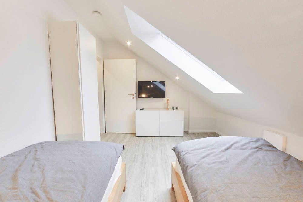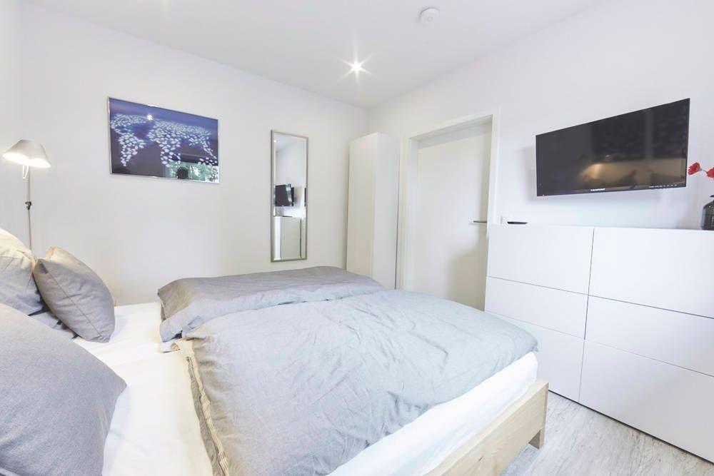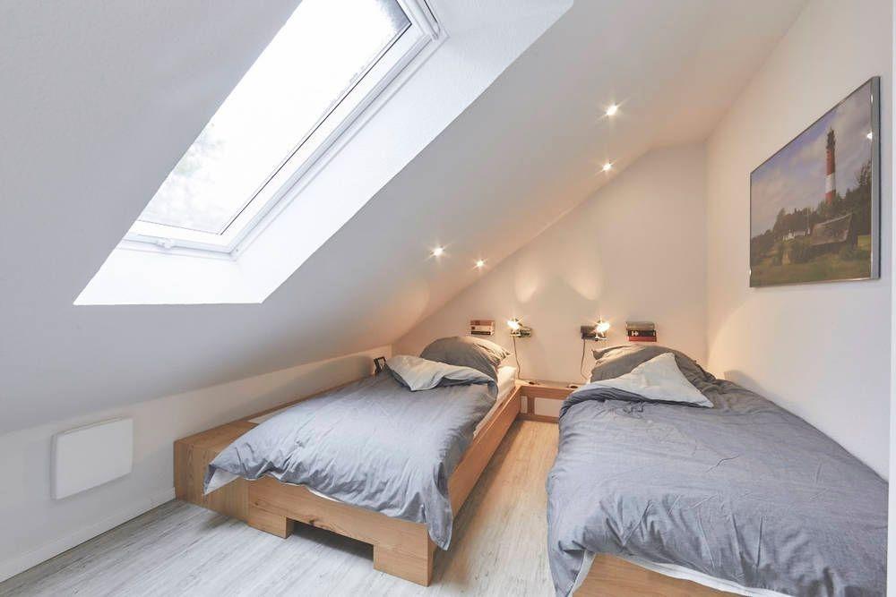 Im Obergeschoss befinden sich zwei weitere Schlafzimmer, die jeweils mit einem Flachbildfernseher ausgestattet sind. Auch in diesen Zimmern haben wir Wert auf einen optimalen Schlaf gelegt und die Betten mit extra hohen gemütlichen Matratzen ausgestattet. In dem größeren der beiden Zimmer finden Sie ein 180 x 200 cm großes Doppelbett, während das andere Zimmer mit zwei 90 x 200 cm Einzelbetten ausgestattet ist.