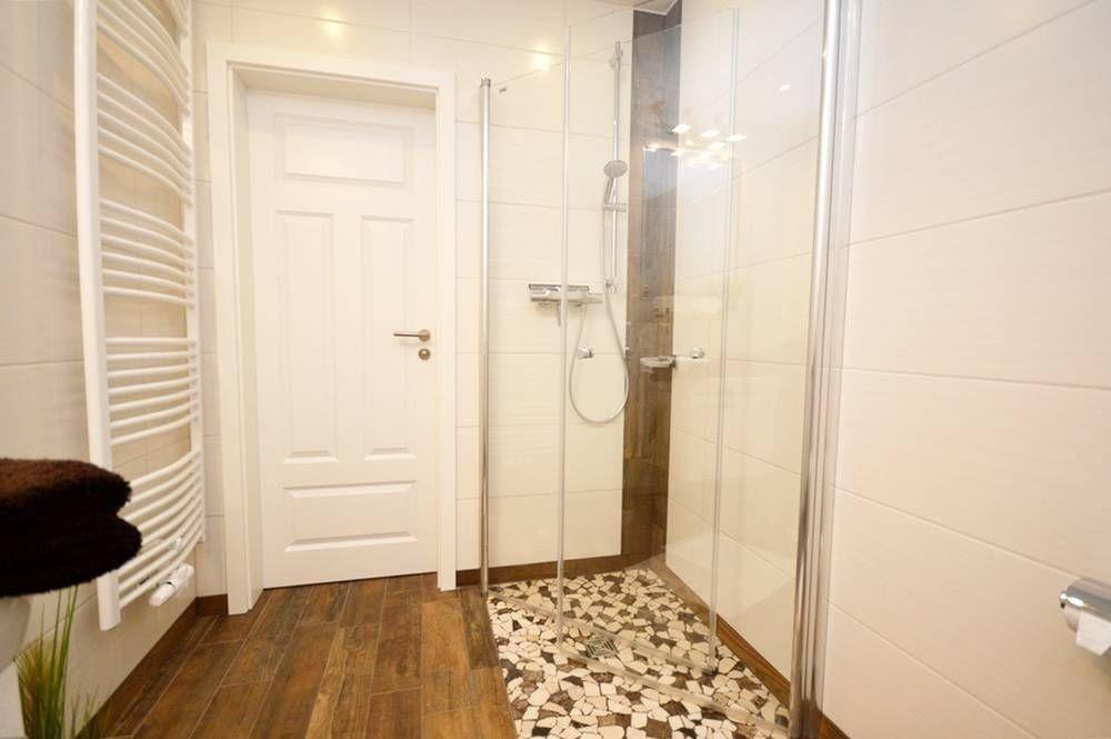 Das Badezimmer verfügt über eine ebenerdige Dusche mit Echtglastüren, ein Wand-WC, ein Waschtisch mit Unterschrank, Kosmetikspiegel sowie ein Fön.