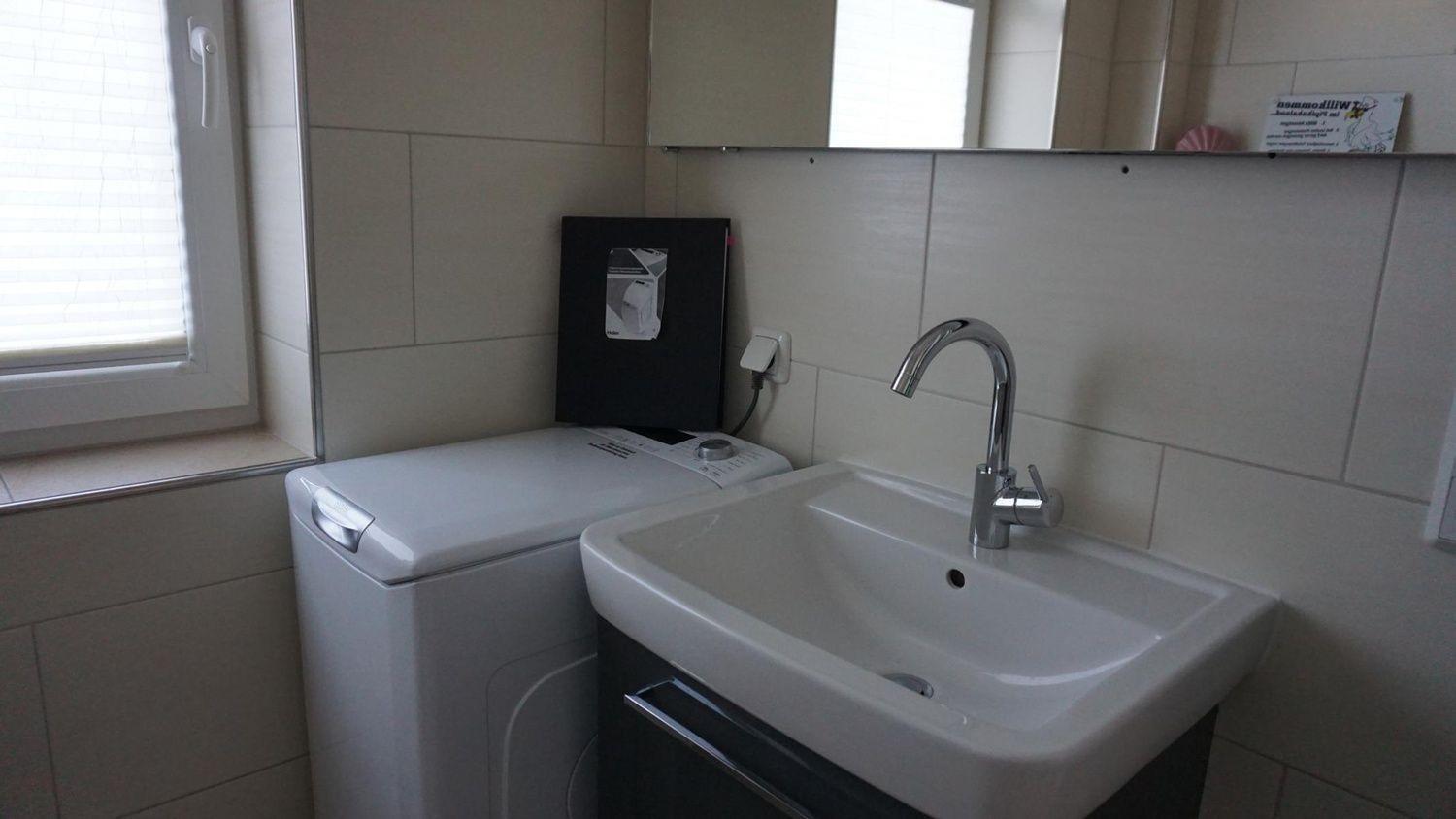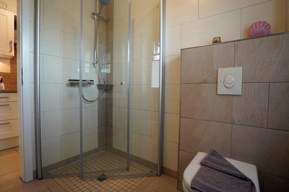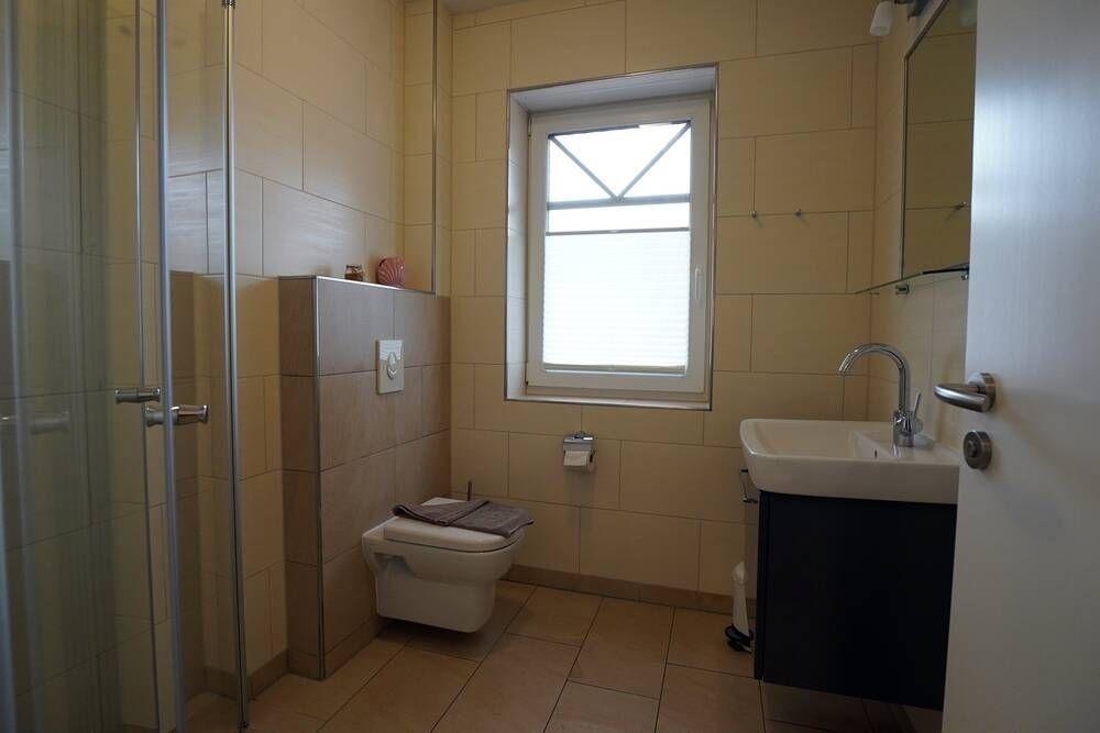 Das Tageslicht-Bad mit ebenerdiger Dusche, Waschtisch mit Unterschrank und WC sind auf dem neuesten Stand.