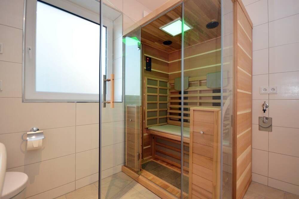 Im großzügigem Bad können Sie in der Infrarot-Wärmekabine mit Musik entspannen.