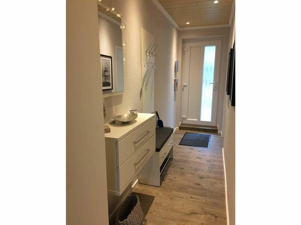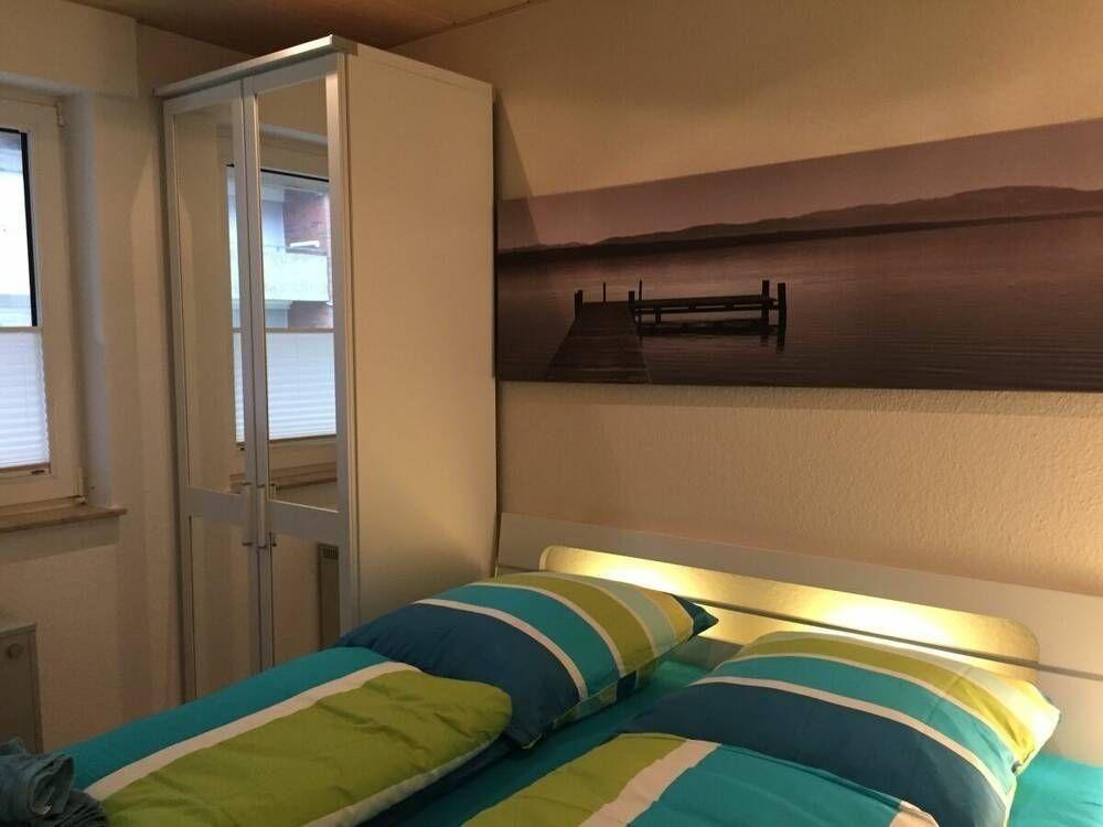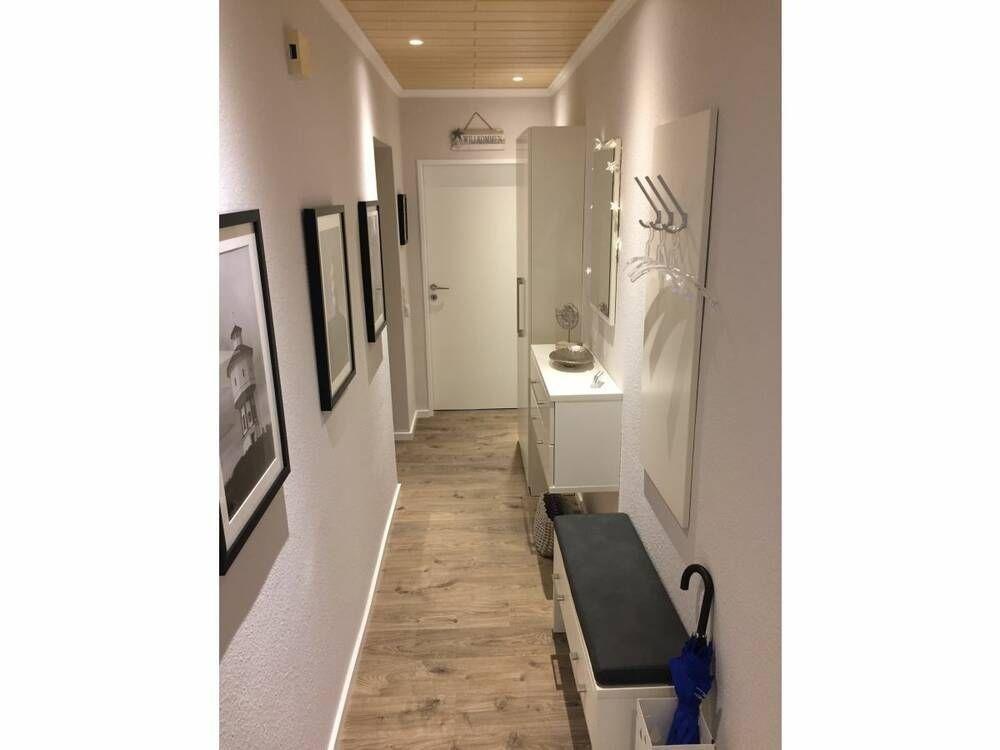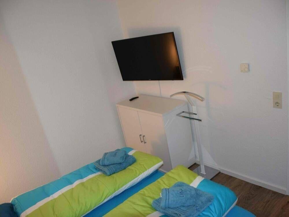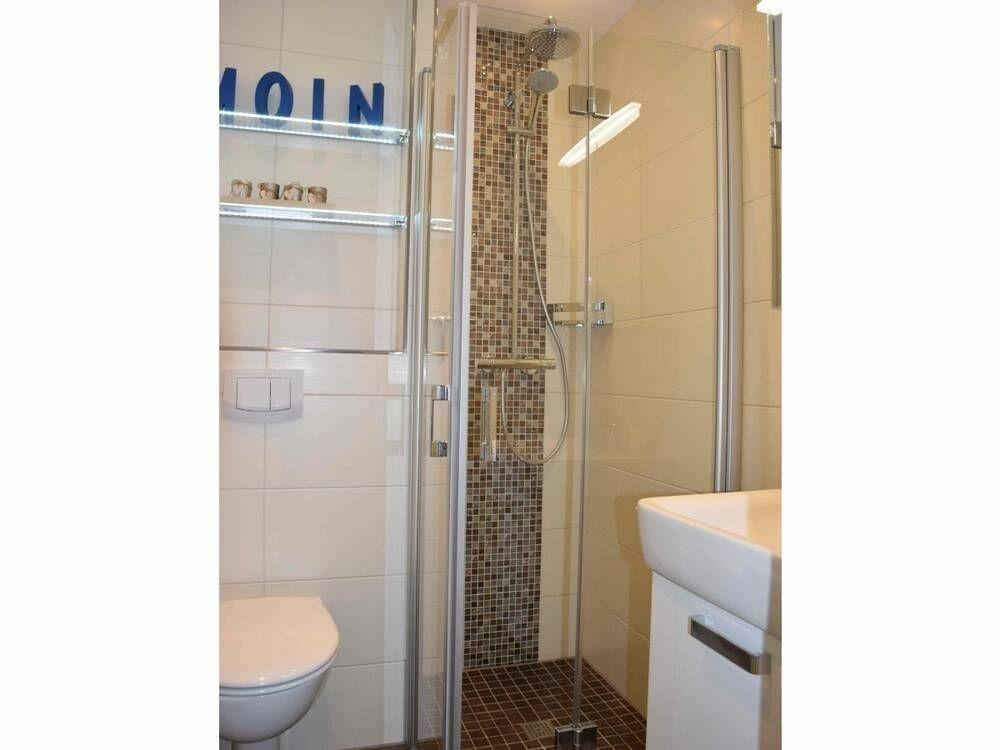 Kleines Schlafzimmer mit TV (43), Kommode + Spiegelschrank. Modernes innenliegendes Bad mit bodentiefer Dusche. Die sonnige Terrasse mit Gartenmöbel, Strandkorb und elektr. Kompakt-/Tischgrill machen die Wohnung zu einem perfekten Urlaubsdomizil.
