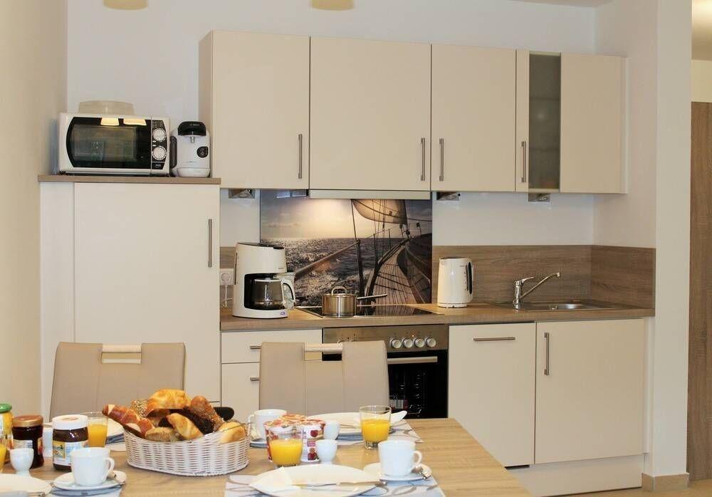 Die offene Küche mit Esstisch und 4 Stühlen ist sehr gut ausgestattet.