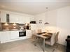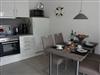 Die helle Hochglanzküche ist mit Geschirrspüler, 4-Platten-Cerankochfeld, Backofen, Kühlschrank/Gefrierfach und Mikrowelle, Kaffeemaschine, Wasserkocher und Toaster ausgestattet.