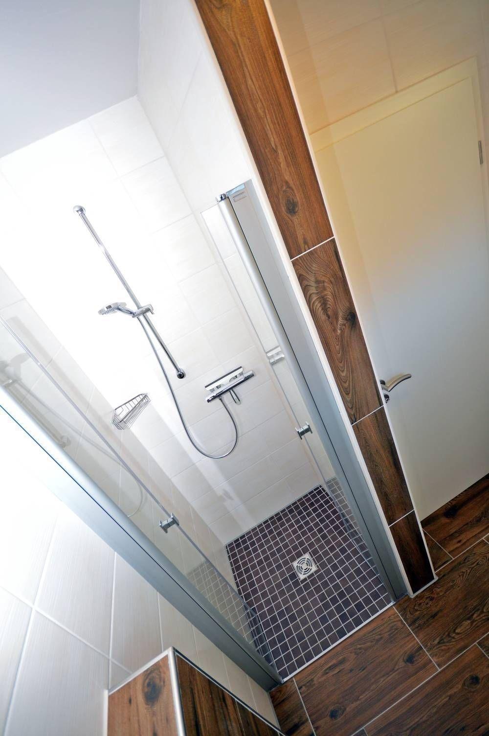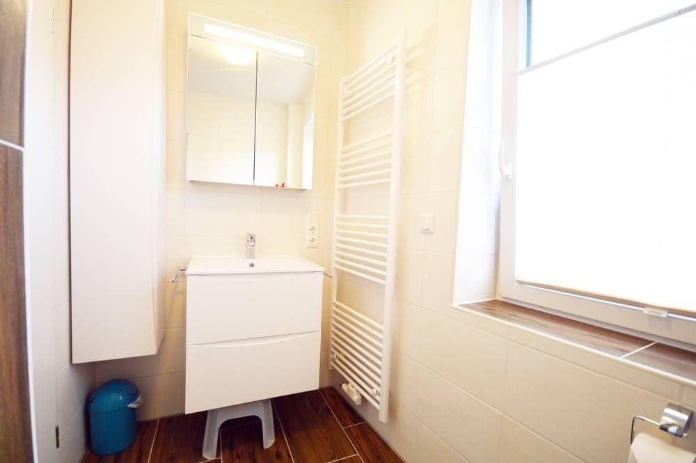 Das Badezimmer trumpft mit einer bodentiefen Dusche, einem Handtuchwärmer, Fön, Einbauradio und einem Spiegelschrank auf. Ausreichend Stell- und Ablageflächen sind vorhanden.