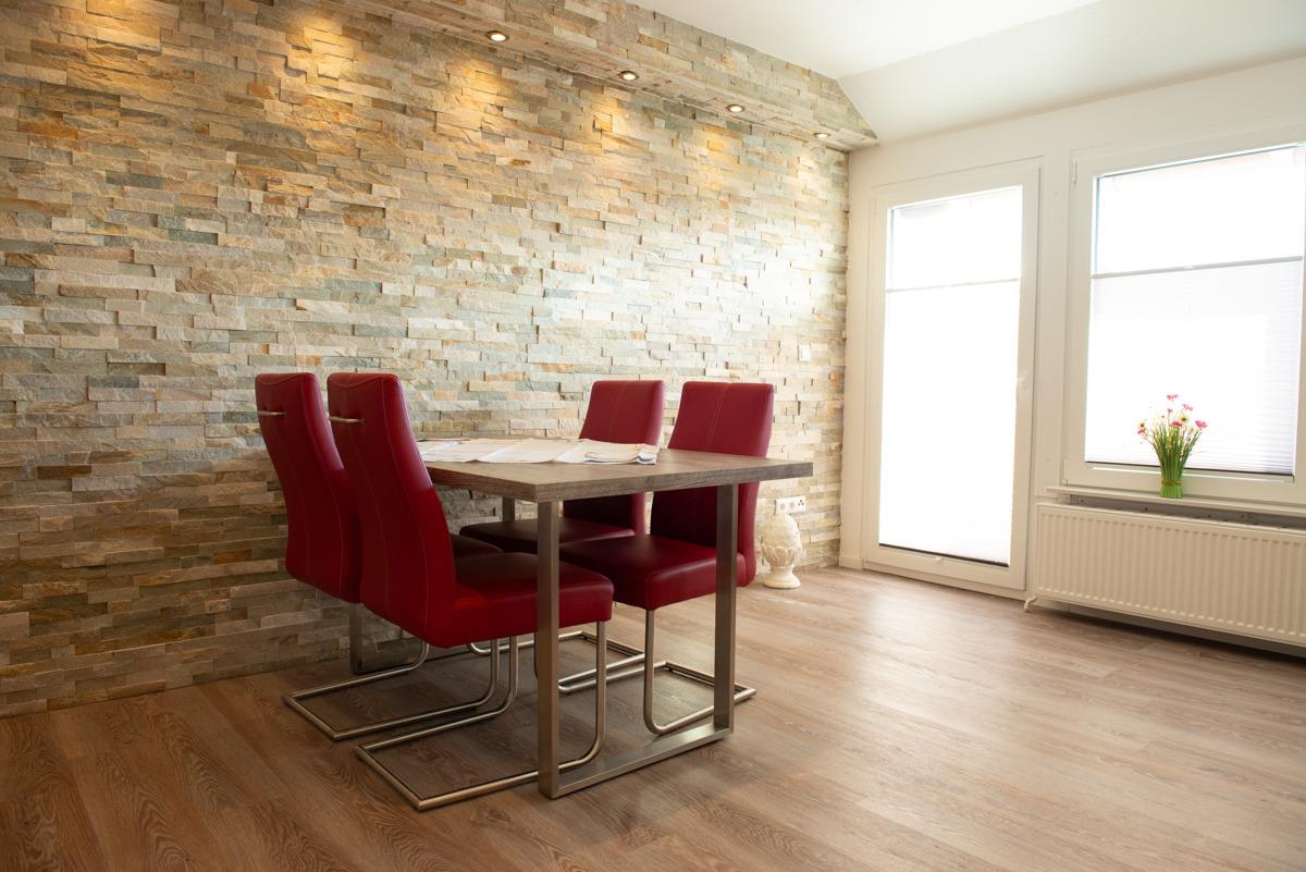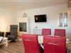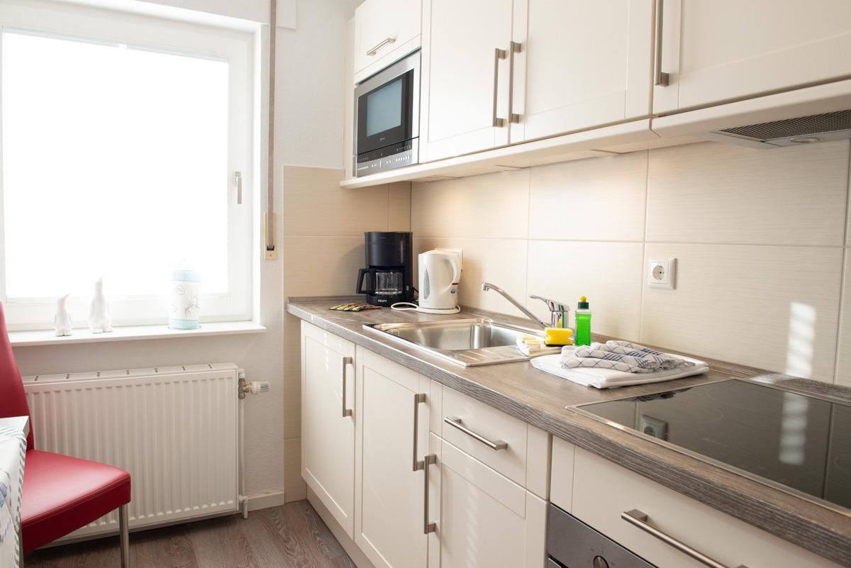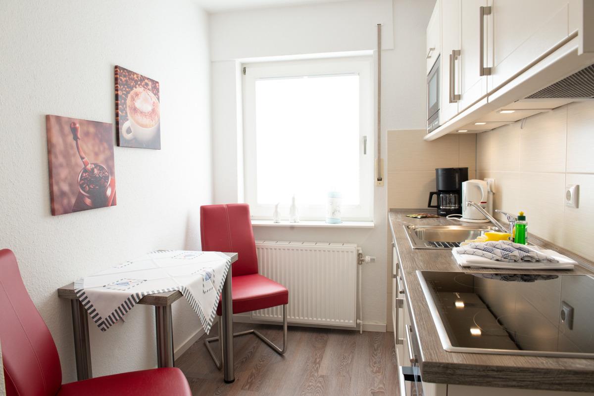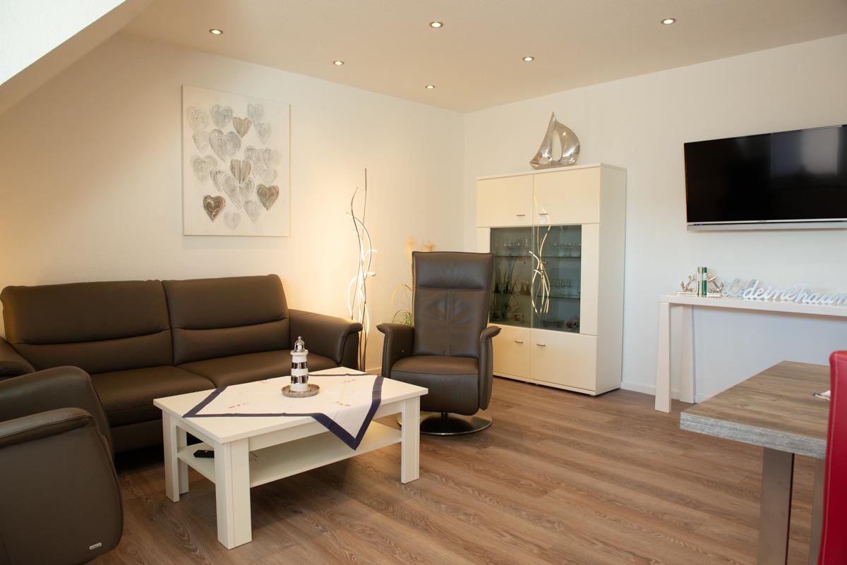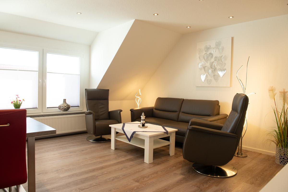 Im Wohn - Essbereich mit Tisch und 4 Stühlen sowie einer gemütlichen Couch, zwei Relax-Sessel und Sat/TV mit Flachbildschirm können Sie entspannt relaxen und der Balkon lädt zum Sonnenbaden ein. Die Küche ist getrennt vom Wohnbereich und hält alle Kochutensilien für Sie bereit.