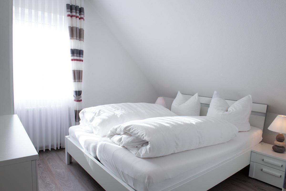 Die Ferienwohnung Clipper liegt im 2. OG und verfügt über zwei getrennte Schlafzimmer, davon ist das untere Schlafzimmer mit Außenrollläden und Sat/TV ausgestattet. Das 2. Schlafzimmer geht über eine Treppe innerhalb der Wohnung eine Etage höher und hat Verdunkelungs - Plissees. Das moderne Bad/WC ist mit einem Veluxfenster, einer bodenebenen Dusche und einem Handtuchhalter - Heizungskörper ausgestattet.