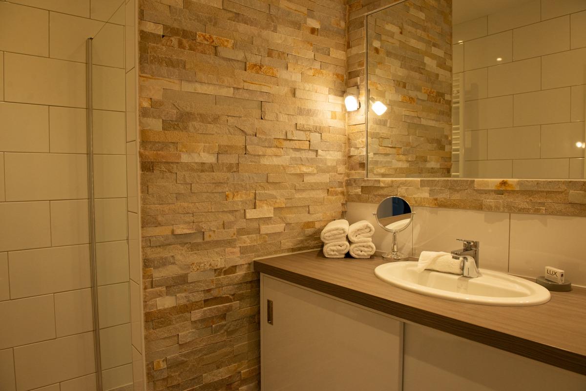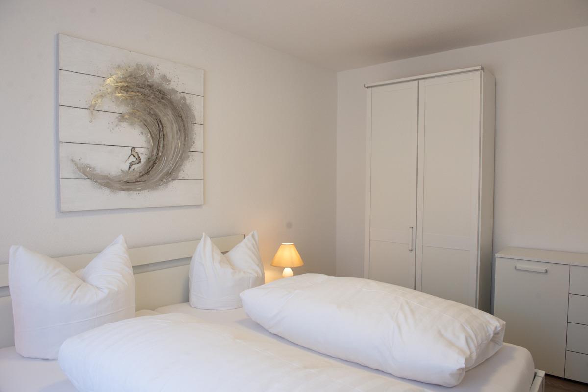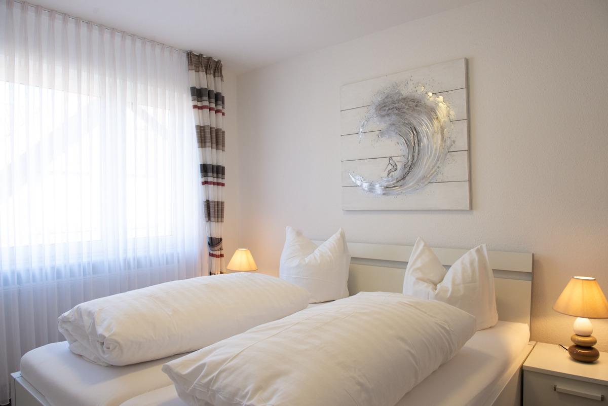 Die stilvolle Ferienwohnung Florence im 1. Obergeschoss bietet zwei separate Schlafzimmer mit Außenrollläden, eines davon mit Sat-TV. Das moderne Badezimmer überzeugt mit bodenebener Dusche, Handtuchheizung und Tageslicht, während das WC separat liegt.