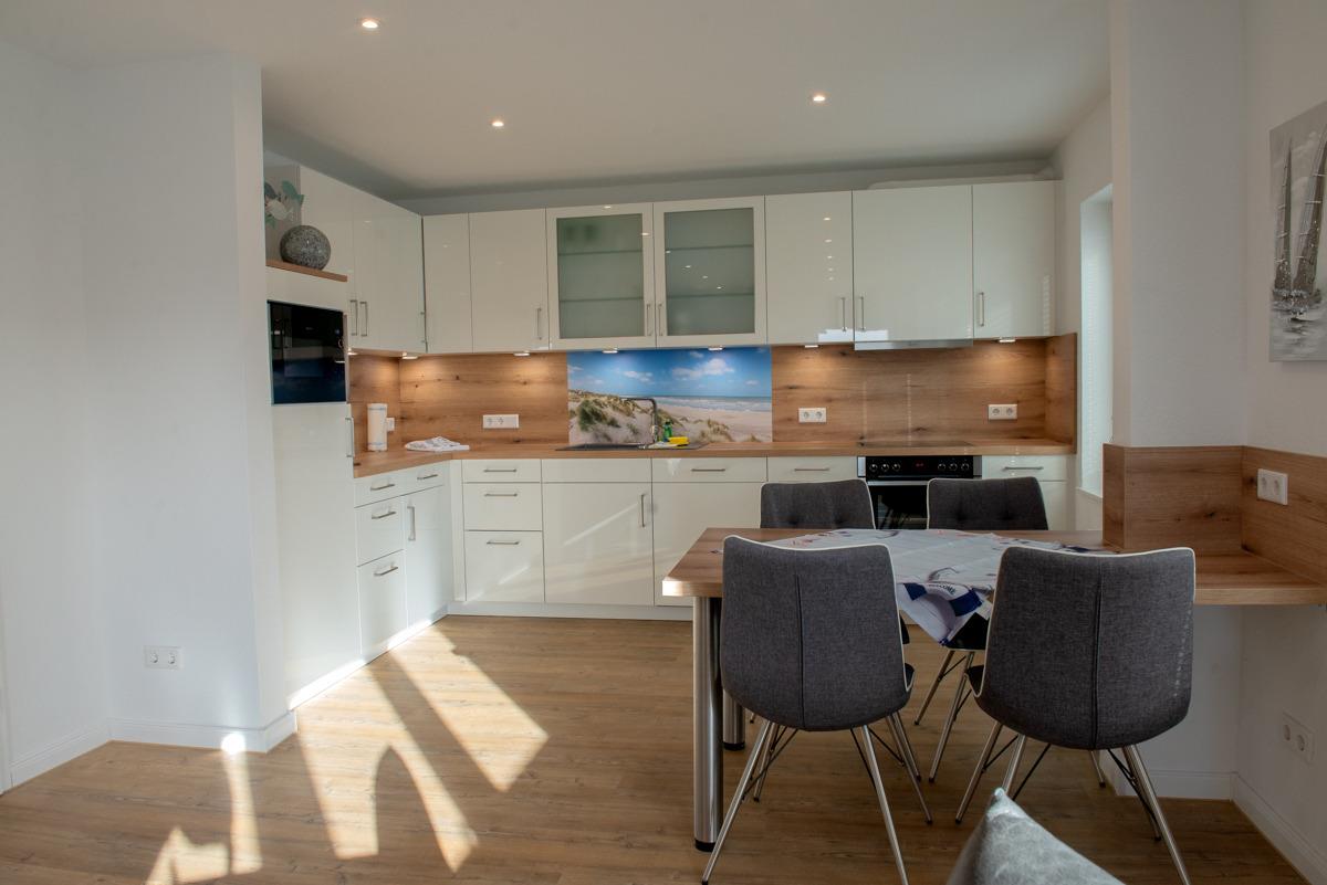 Das große Wohn - Esszimmer, mit integrierter, komplett ausgestatteter Einbauküche, einer Couch und 2 Relax-Sessel und einer gemütlichen Essgruppe, bietet viel Platz. Von hier aus gelangt man auf den schönen Sonnenbalkon, der mit Gartenmöbel und einer Markise ausgestattet ist.