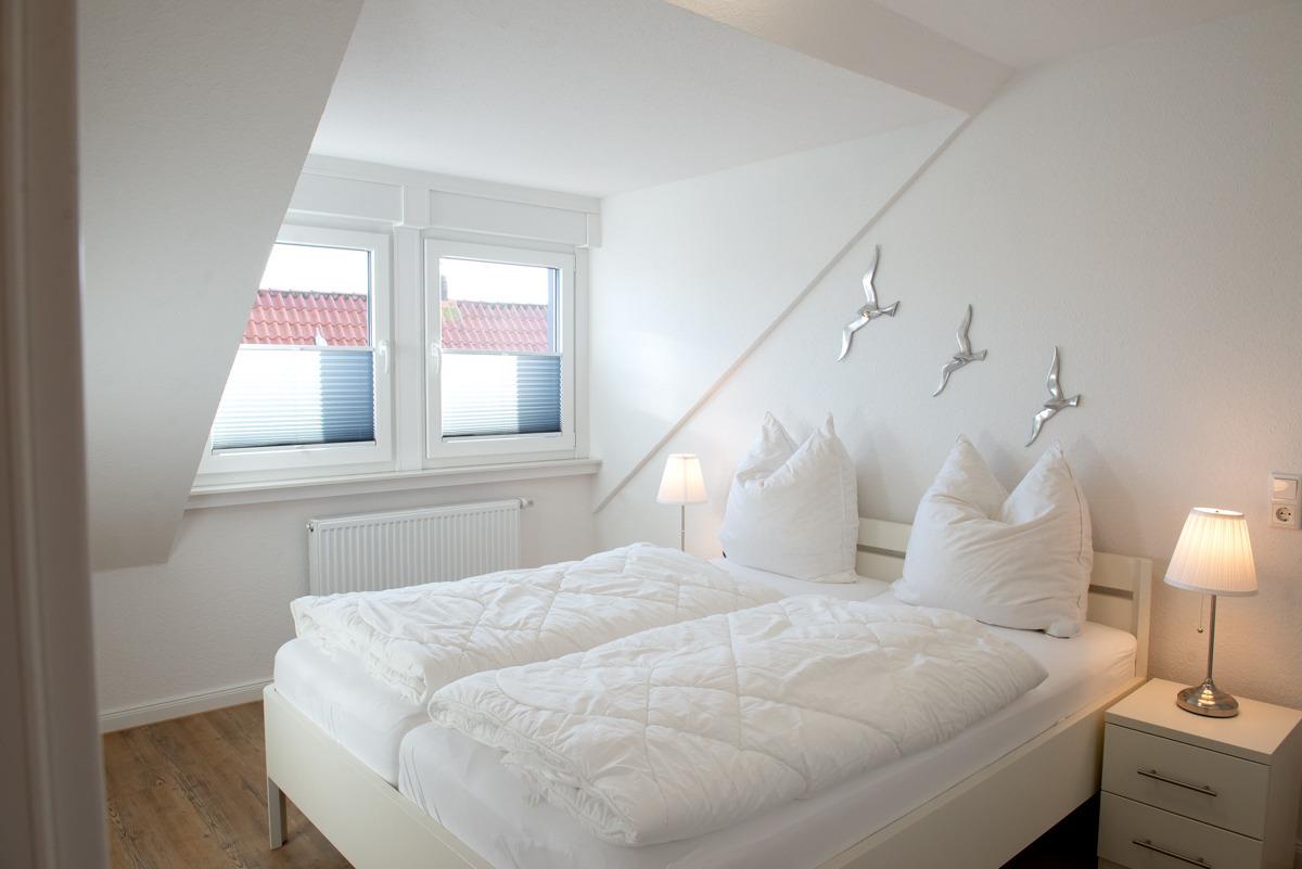Die Wohnung besitzt 2 getrennte Schlafzimmer, in der gleichen Ebene wie Wohn - Esszimmer und Bad, ein Schlafzimmer mit einem Doppelbett und Fernseher Sat/TV, über eine schöne Holztreppe erreichen Sie das zweite Schlafzimmer, welches mit einem Einzelbett ausgestattet ist. Beide Schlafzimmer besitzen zusätzlich Außenrollläden.