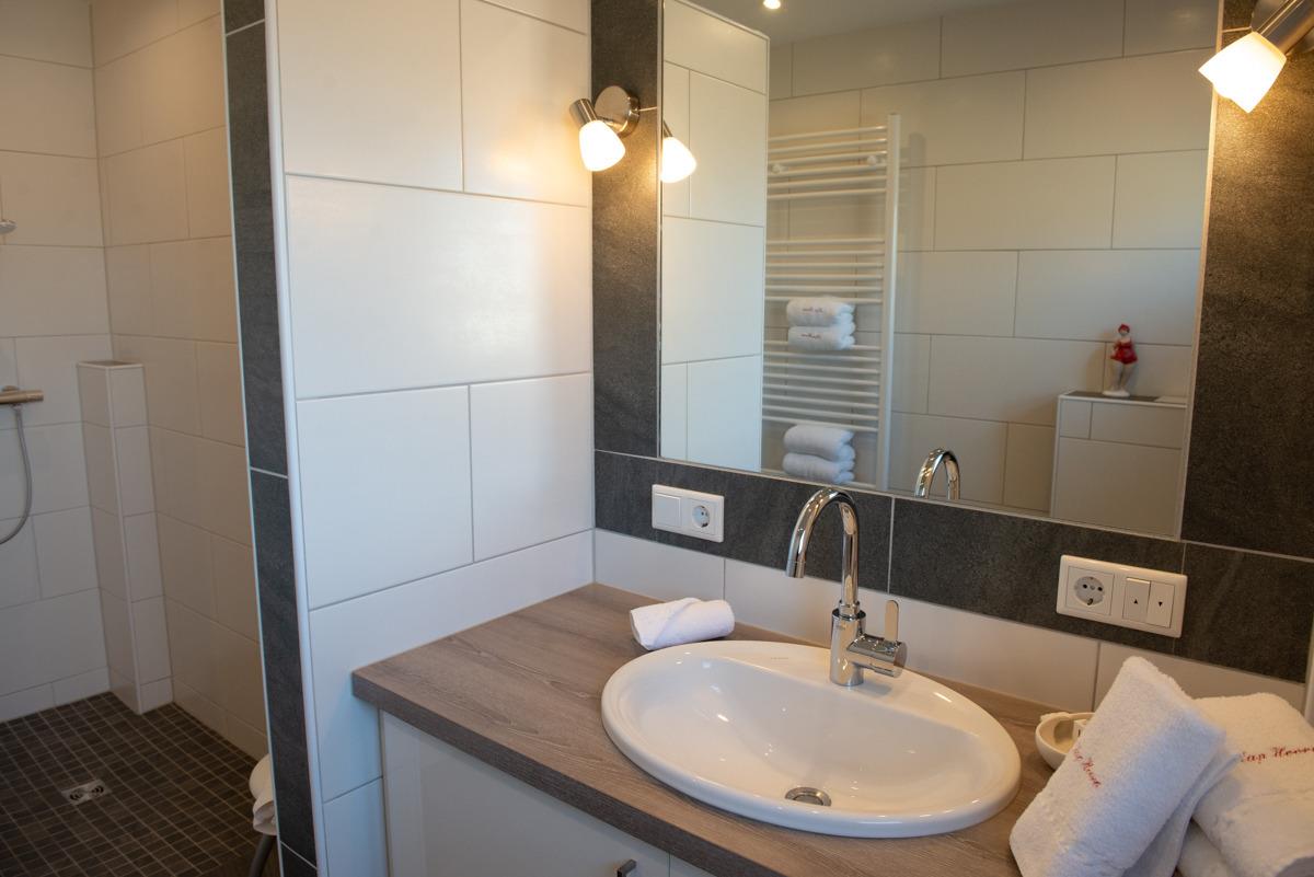Das moderne Bad/ WC ist mit einer bodenebenen Dusche und einem Einbau -Waschtisch mit großem Spiegel ausgestattet.