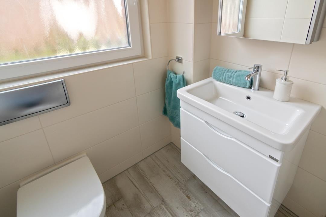 Das Badezimmer ist mit einer Dusche, einem WC sowie einer Waschkombination mit Spiegel ausgestattet. Die Waschmaschine steht im Gemeinschaftswaschraum des Hauses und darf gerne genutzt werden.