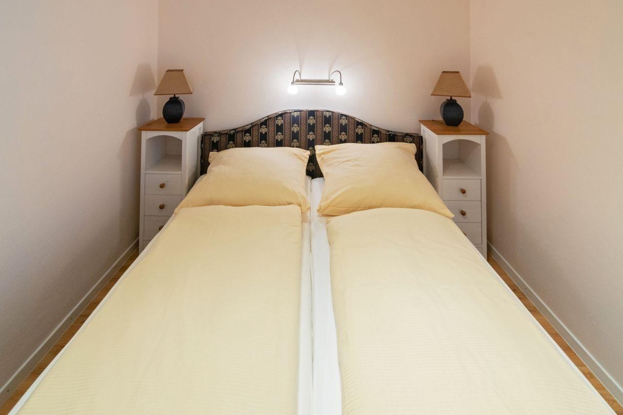 Die Ferienwohnung verfügt über ein gemütliches kleines Schlafzimmer, welches mit einem 160 x 200 cm großen Doppelbett mit separaten Matratzen und einem kleinen Kleiderschrank ausgestattet ist. Ihre übrige Garderobe und weitere Utensilien lassen sich zudem im praktischen Wandschrank im Wohnbereich verstauen.