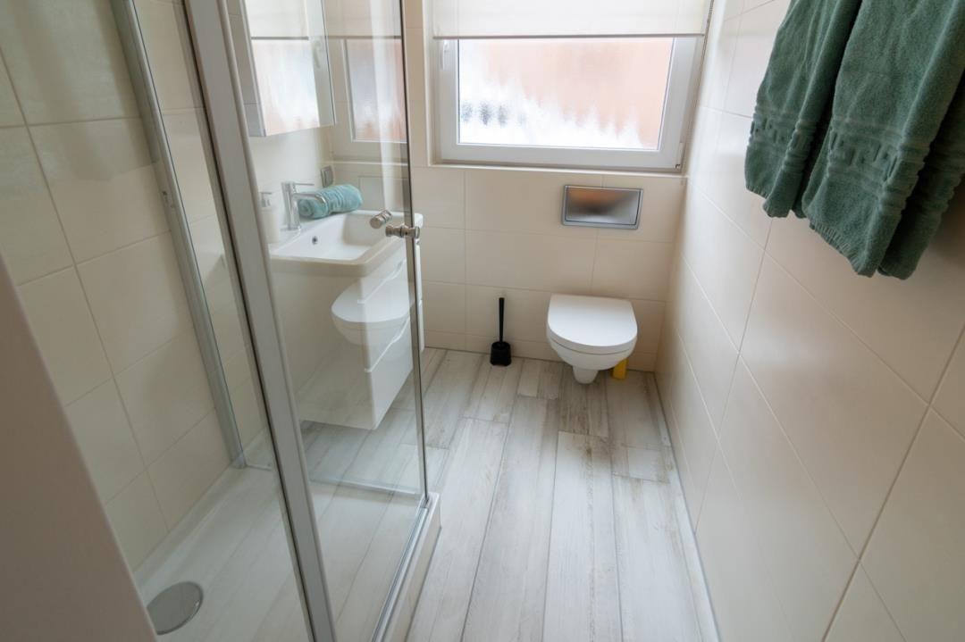 Im Schlafraum finden Sie für Ihre Nachtruhe zwei Einzelbetten mit den Maßen 80 x 200 vor. Ein kleiner Schrank bietet Raum für Ihre Garderobe. Das Badezimmer ist mit Dusche, einem WC sowie einer Waschkombination mit Spiegel ausgestattet. Die Waschmaschine finden Sie im Gemeinschaftswaschraum des Hauses. Diese steht Ihnen ebenfalls bei Bedarf kostenlos zur Verfügung.