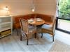 Von hier aus führt eine Tür hinaus auf die Terrasse, der mit entsprechenden Sitzgelegenheiten und einer kleinen eingezäunten Gartenfläche. Dank seiner südwestlichen Ausrichtung können Sie hier an Sommertagen bis in den Abend hinein die Sonnenstrahlen genießen und einen schönen Ferientag passend ausklingen lassen.