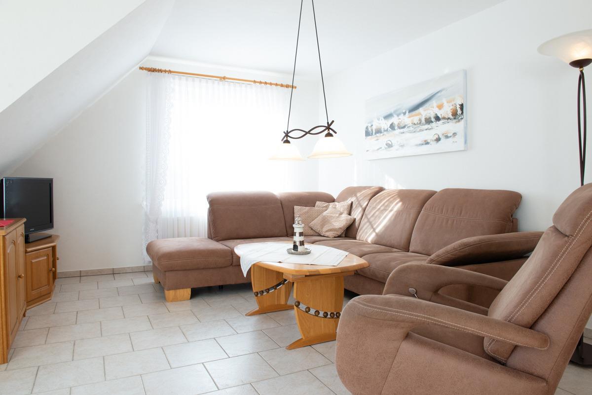 Die Ferienwohnung Rotbuche 2 befindet sich im 1. OG und dort ist alles auf einer Ebene. Das Wohn - Esszimmer mit einer gemütlichen Couch und einem Relax-Sessel, Sat/TV und den Zugang zum Balkon. Durch den gemauerten Rundbogen kommt man zur vollausgestatteten Küche mit einer Essgruppe, die ebenfalls einen Durchgang zum Balkon mit einer Gartengruppe und Markise besitzt.