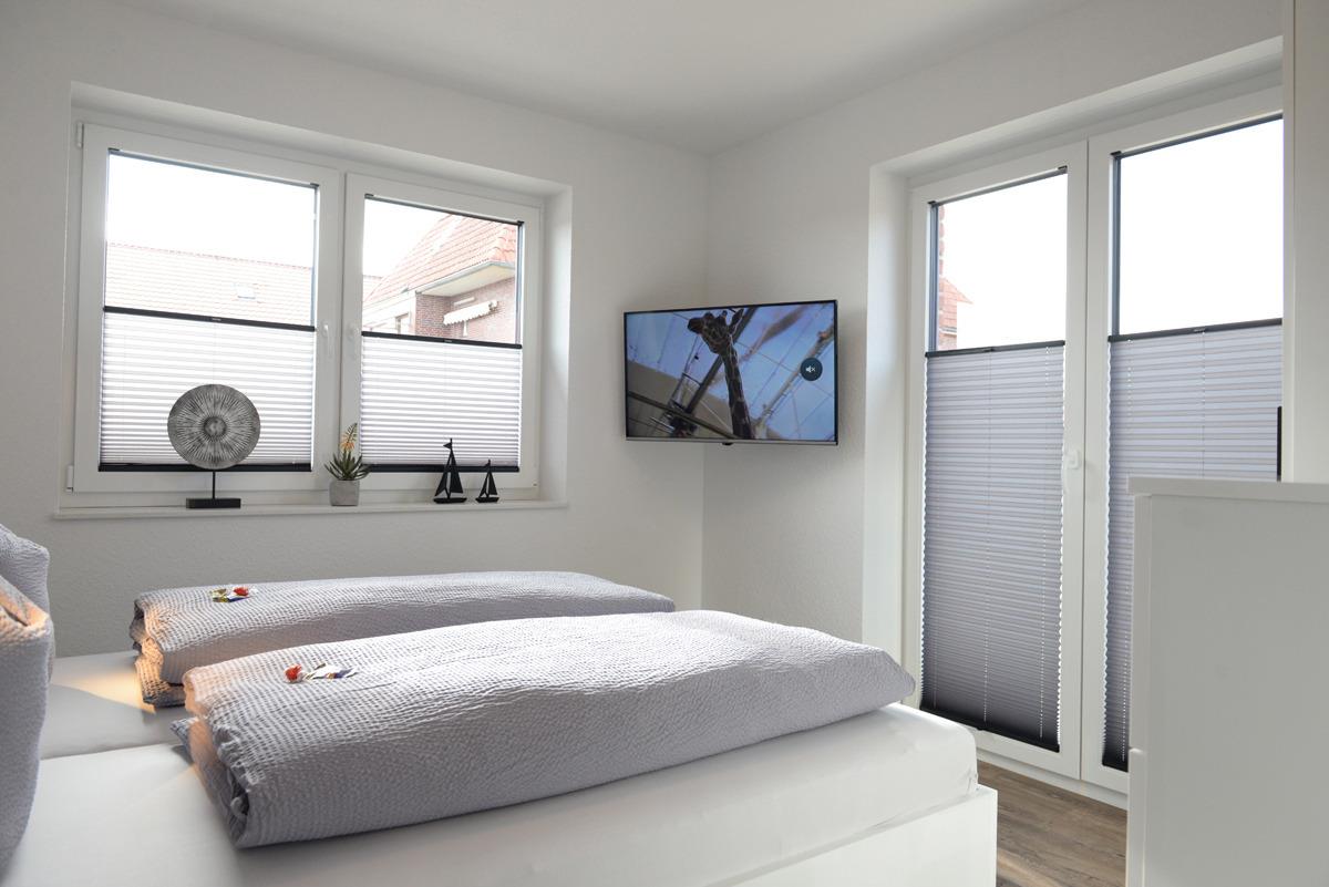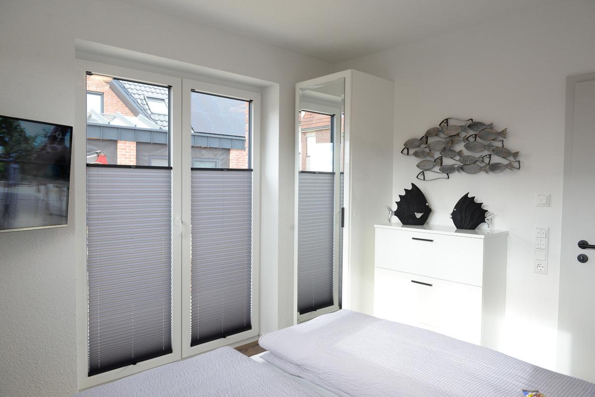 Das Schlafzimmer ist mit einem Doppelbett, Sat/TV, elektrische Außenrollläden + Verdunklungsplissees ausgestattet.