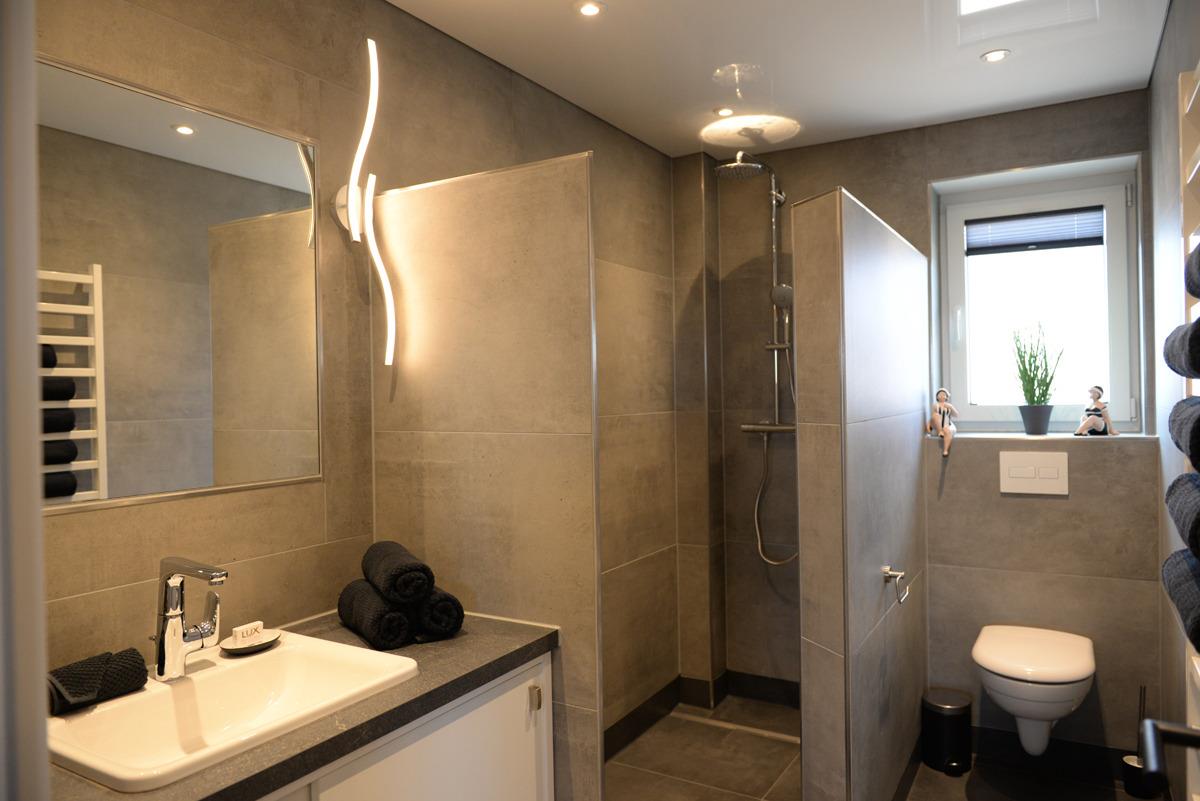 Das moderne Badezimmer mit Fenster verfügt über eine bodenebene Dusche, einem WC, eine Waschtischkombination mit großem Spiegel, Föhn usw.