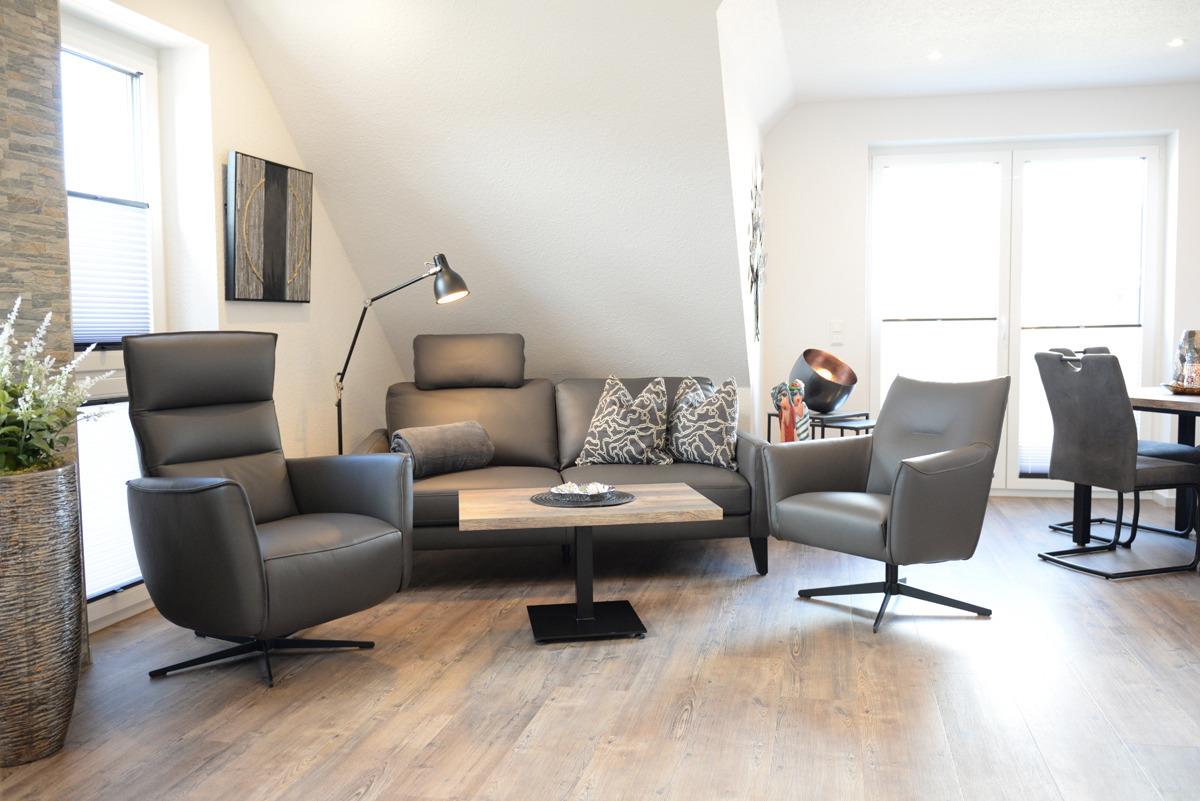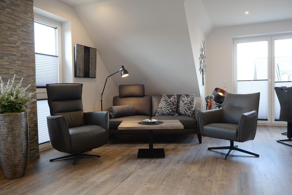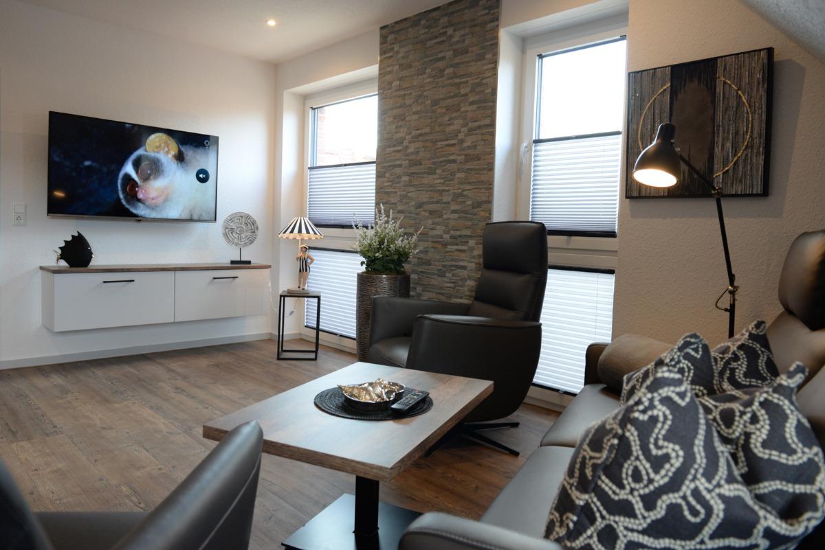 Die Ferienwohnung Deichdeck 1 OL für 2 Personen befindet sich im 1. OG eines neu erbauten Ferienhauses mit insgesamt 4 Ferienwohnungen in Norddeich. Die Wohnung liegt in einer zentralen und sackgassenähnlichen Lage. Das Wohn/Esszimmer ist mit einer gemütlichen Couch u. 2 Sessel, einem Flachbildschirm-Fernseher, einer Essgruppe und einer voll ausgestatteten Einbauküche eingerichtet. Von dort aus gelangen Sie auf einen Balkon, der mit Gartenmöbeln und einem Sonnenschirm ausgestattet ist. Dieses Plätzchen lädt Sie zum Sonnenbaden oder für den späteren Sonnenuntergang am Abend ein.