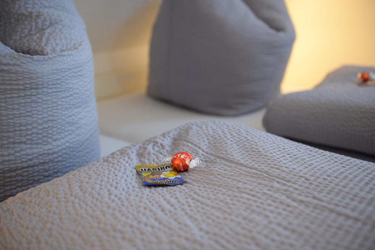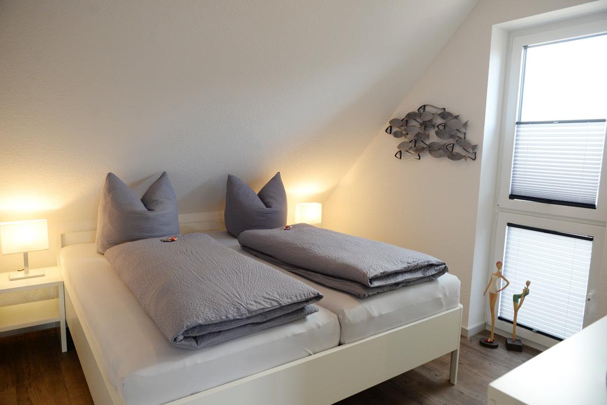 Das Schlafzimmer ist mit einem Doppelbett, Sat/TV, elektrische Außenrolläden + Verdunklungsplissees ausgestattet.