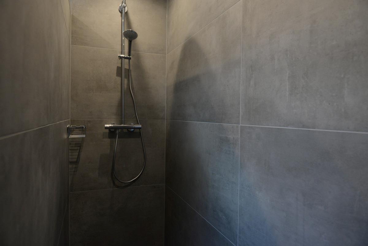 Das moderne Badezimmer mit Veluxfenster verfügt über eine bodenebene Dusche, einen WC, eine Waschtischkombination mit großem Spiegel, Föhn usw.