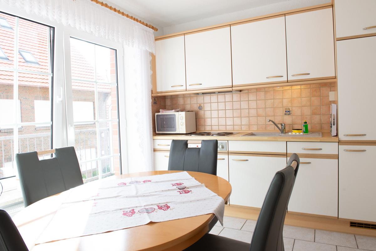 Küchenzeile ist mit Mikrowelle, Geschirrspüler, Kaffeemaschine, Wasserkocher, Toaster und diversem Geschirr ausgestattet. In der Küche befindet sich eine Essgruppe mit 4 Stühlen, von hier aus erreichen Sie den möblierten Balkon mit Markise.
