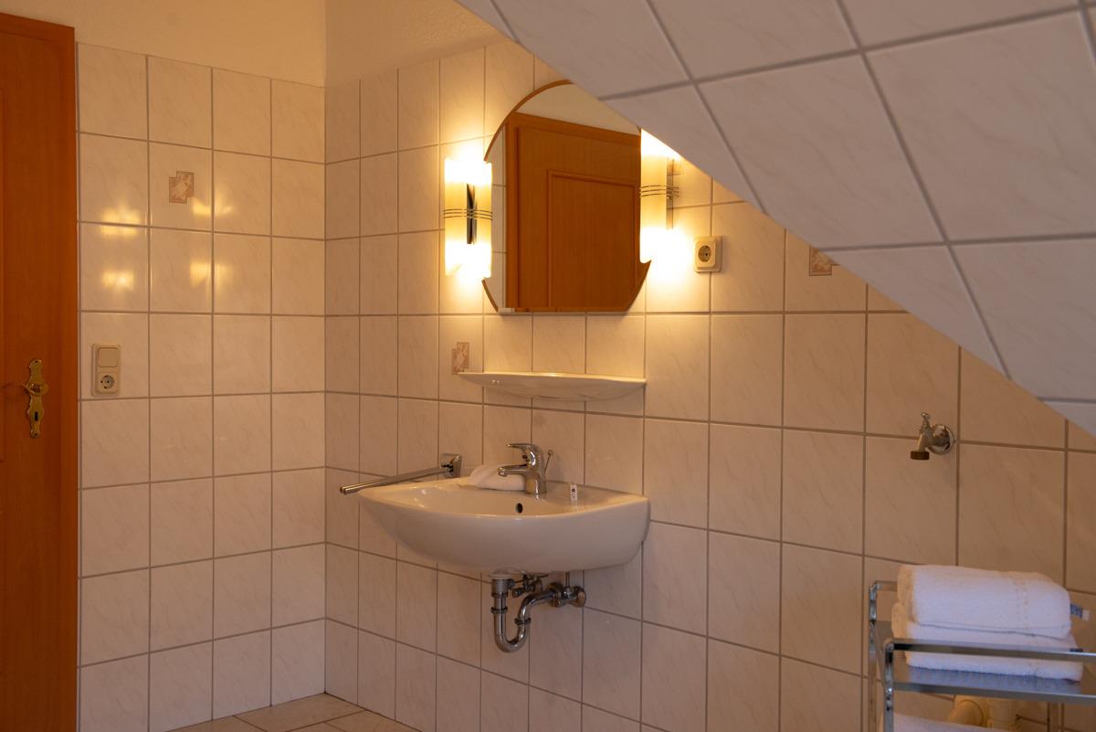 Das große Bad ist mit Waschbecken, Dusche und WC ausgestattet.