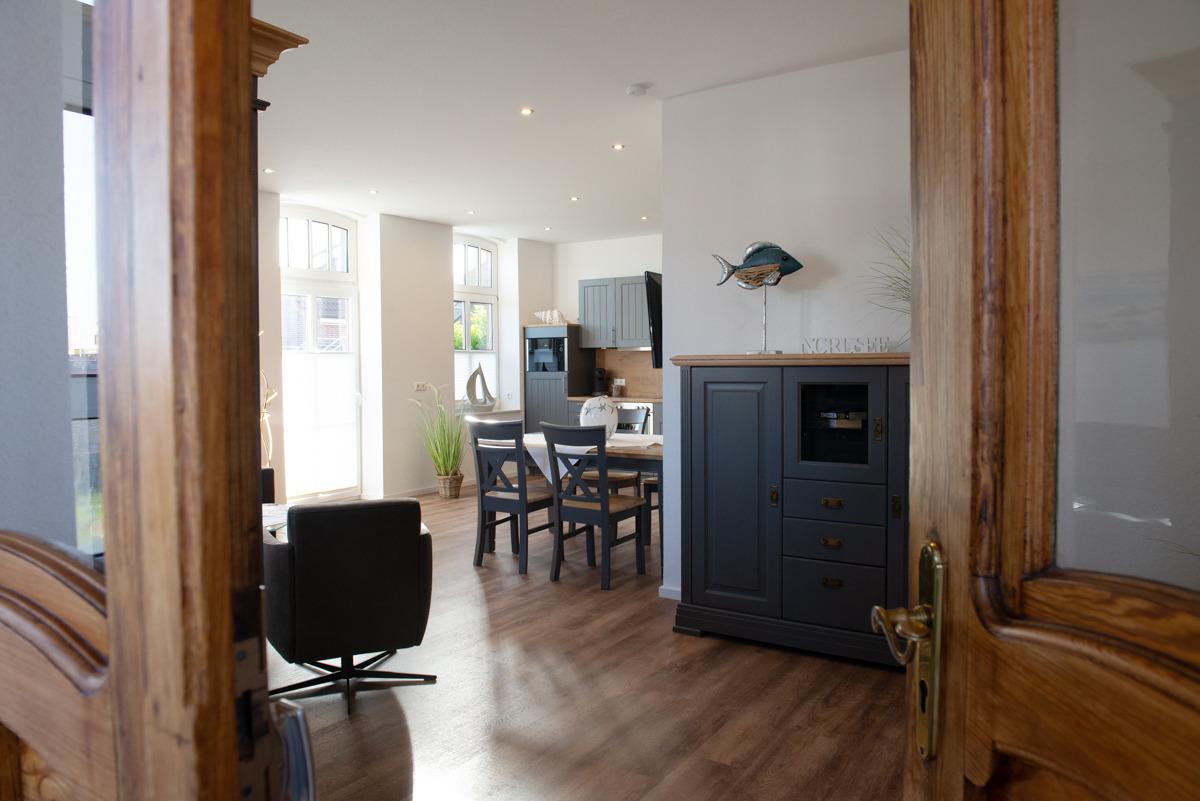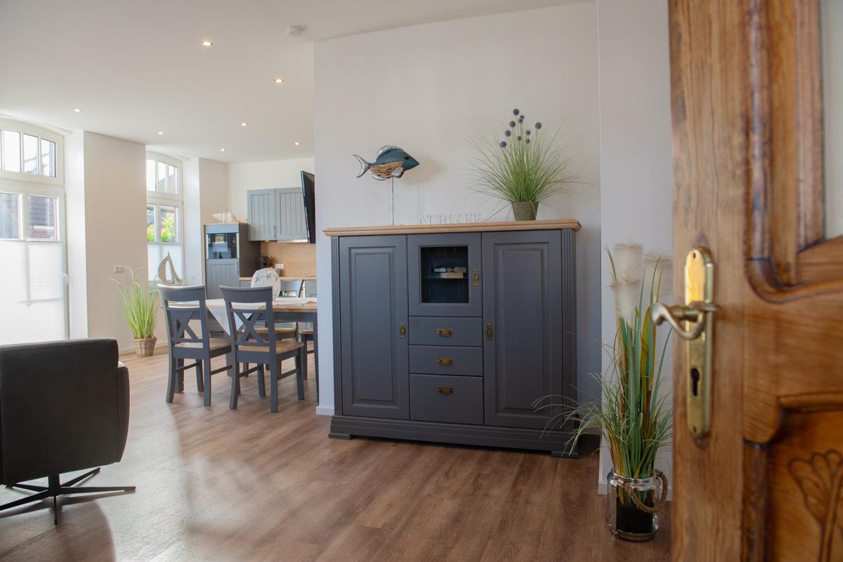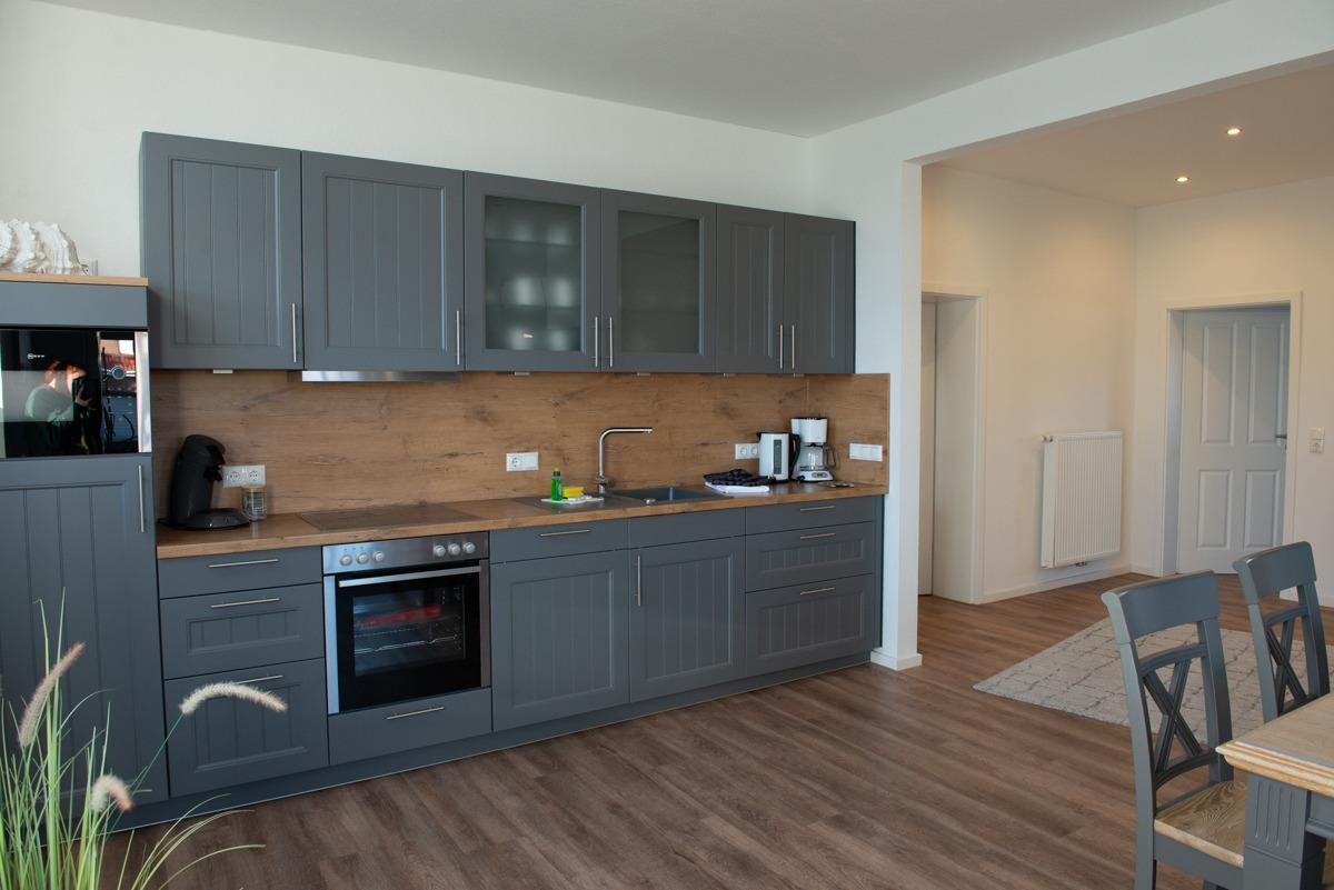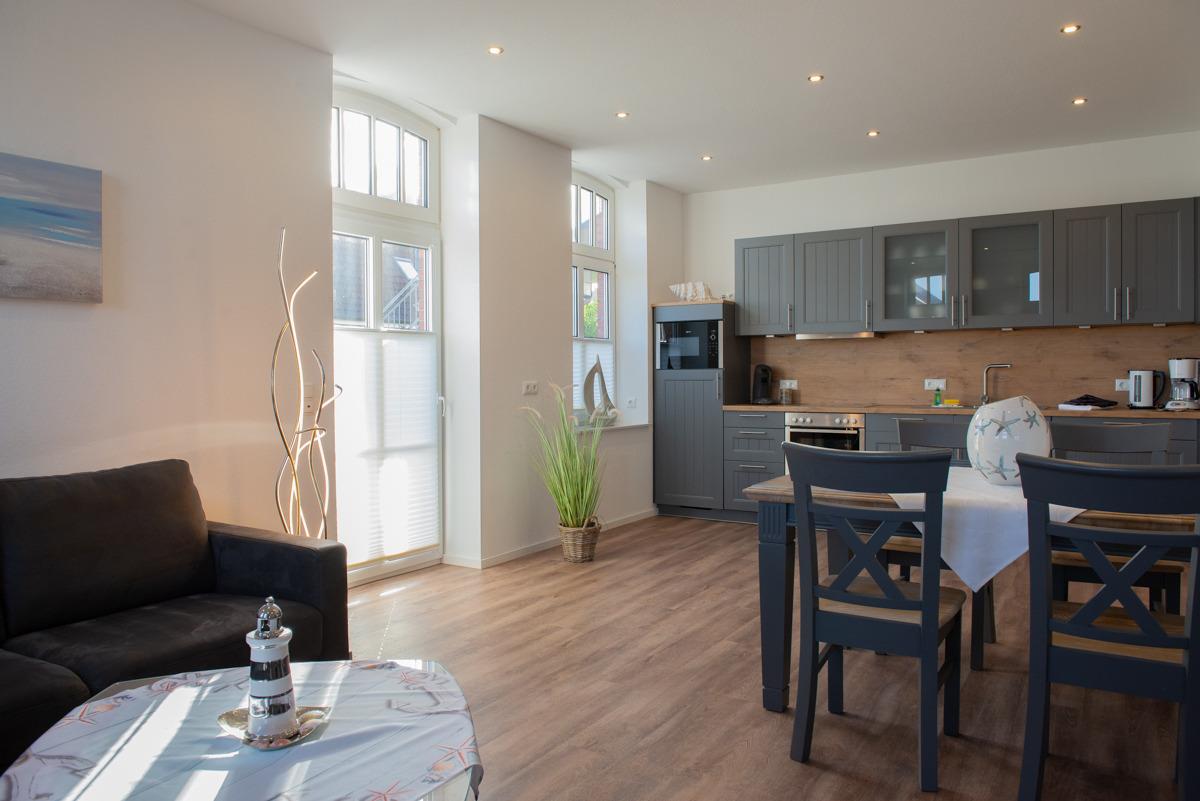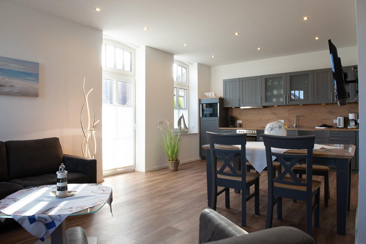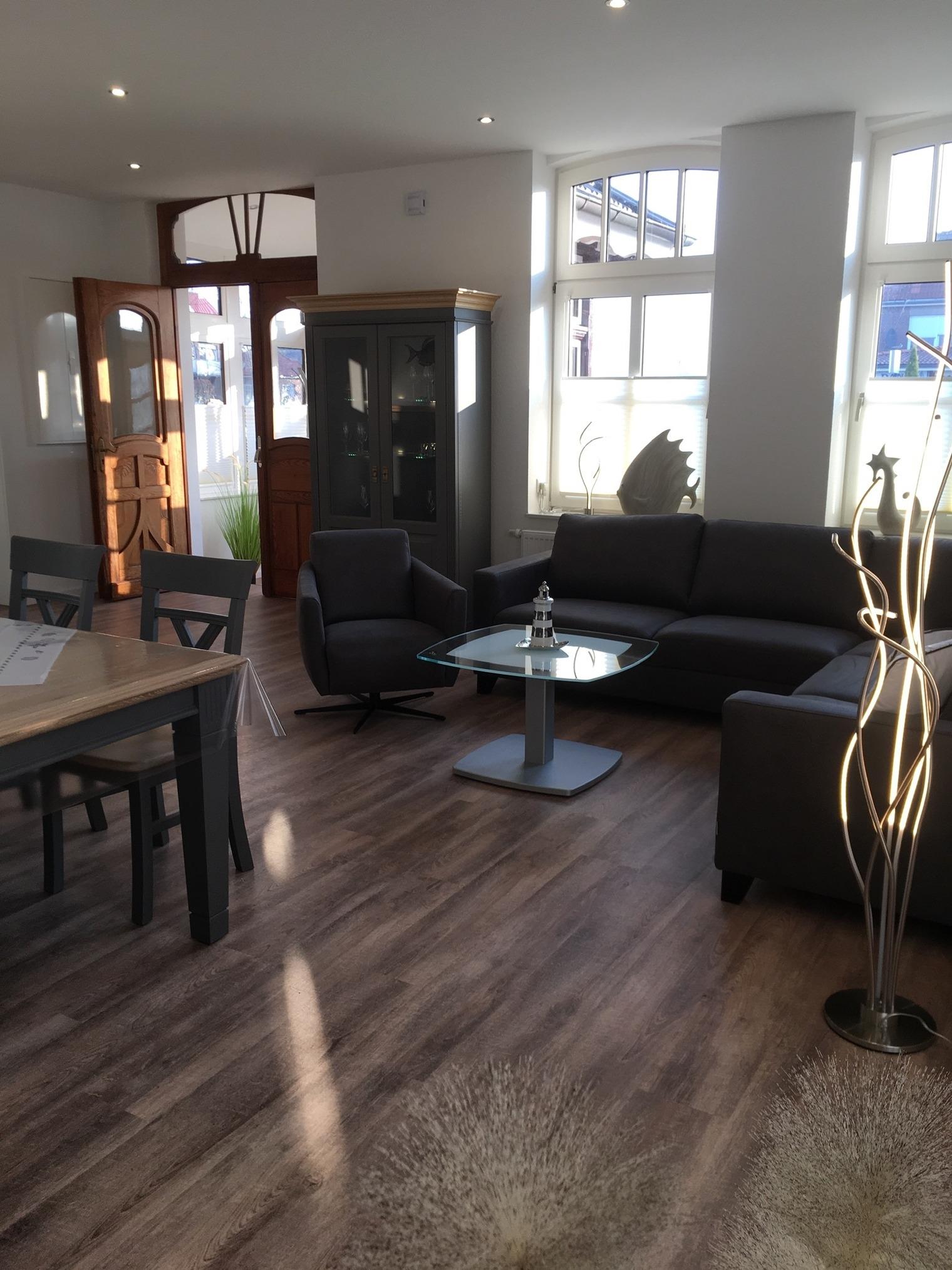 Großes Wohn- und Esszimmer mit integrierter voll ausgestatteter Einbauküche, eine schöne gemütliche Rundgarnitur mit Sessel.