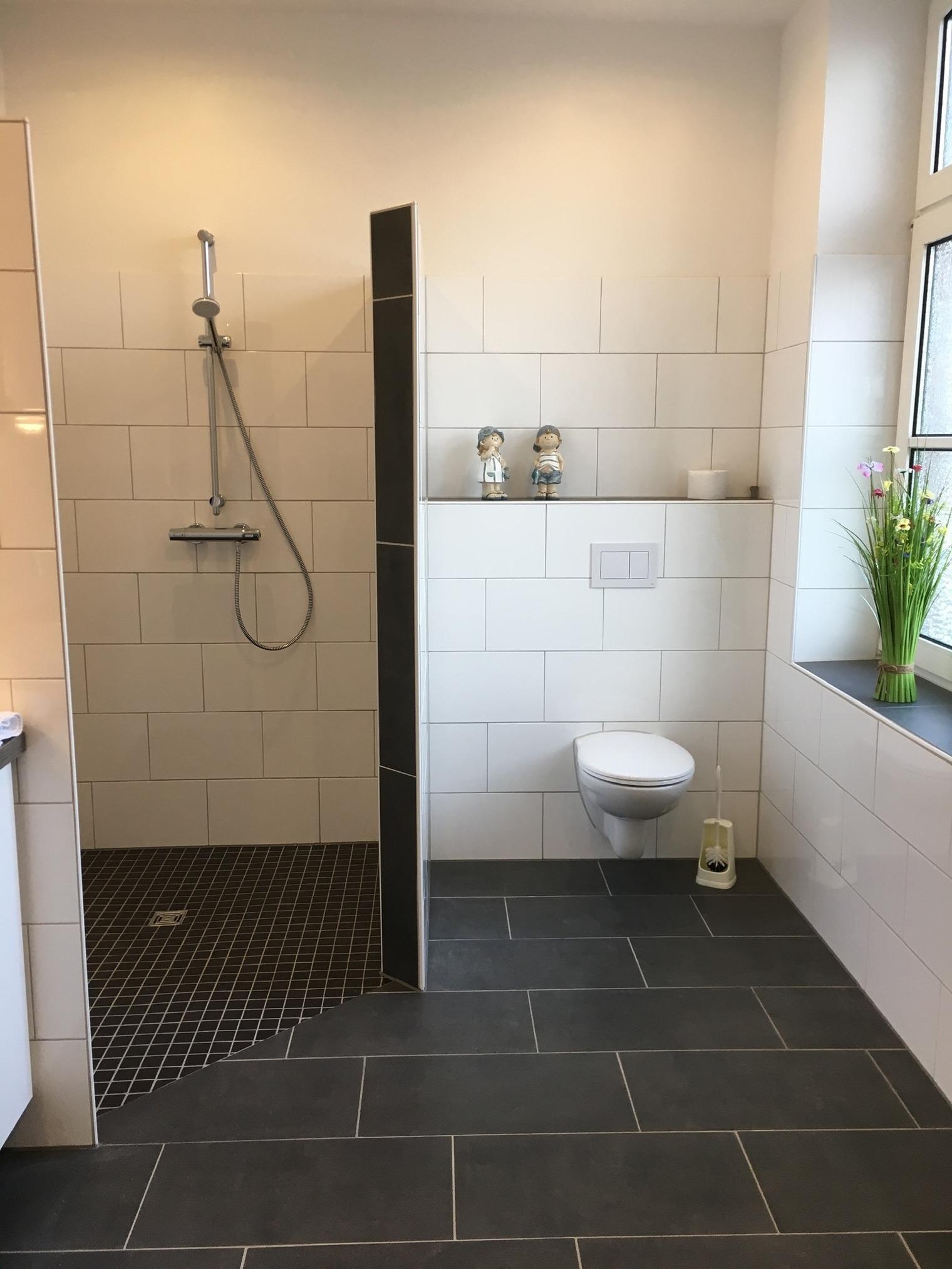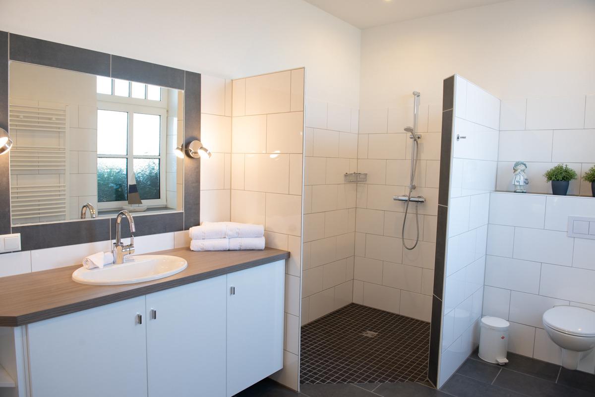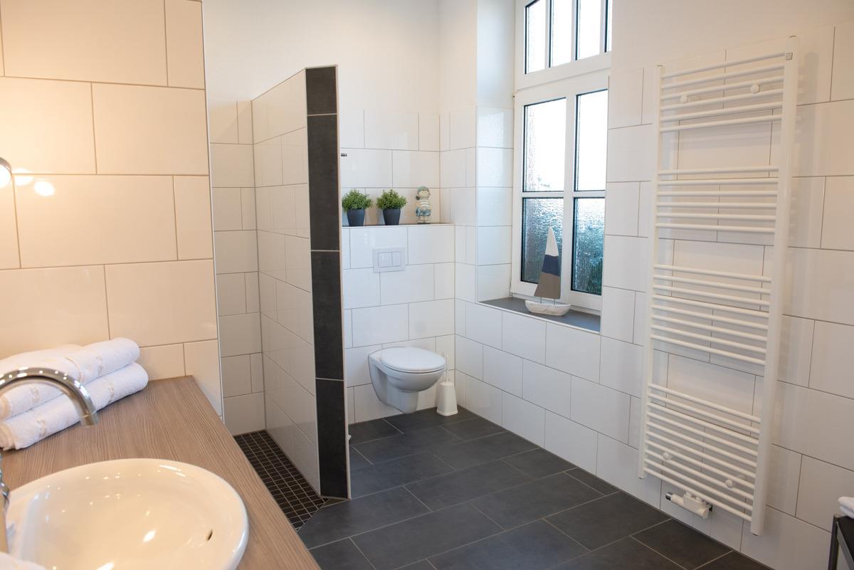 Sehr modernes Bad /WC mit Fenster, mit LED-Beleuchtung und bodenebener Dusche, Waschbecken mit einem Unterbauschrank, ein Fön und Hocker ist auch vorhanden.