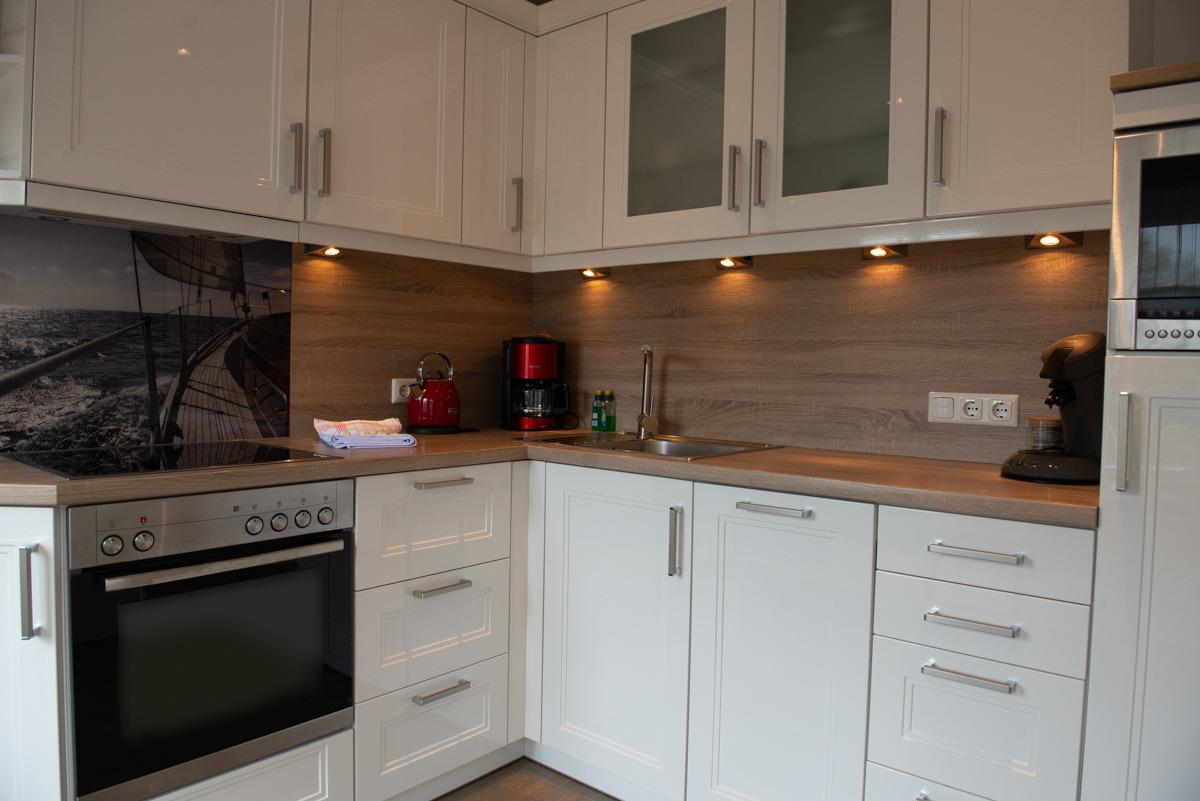-Küche mit Geschirrspüler, Backofen, Mikrowelle, Kühlschrank mit Gefrierfach und Starterset.
