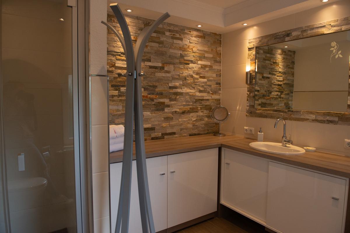 Im Erdgeschoss finden Sie eine voll ausgestattete moderne Einbauküche, das Bad ist mit LED Beleuchtung und ebenerdiger Dusche sowie einem großen Waschbecken und einer Waschmaschine ausgestattet. Der Wohnraum mit angrenzendem Esszimmer hat einen modernen Kaminofen. Im Außenbereich eine Rasenfläche und eine Terrasse.