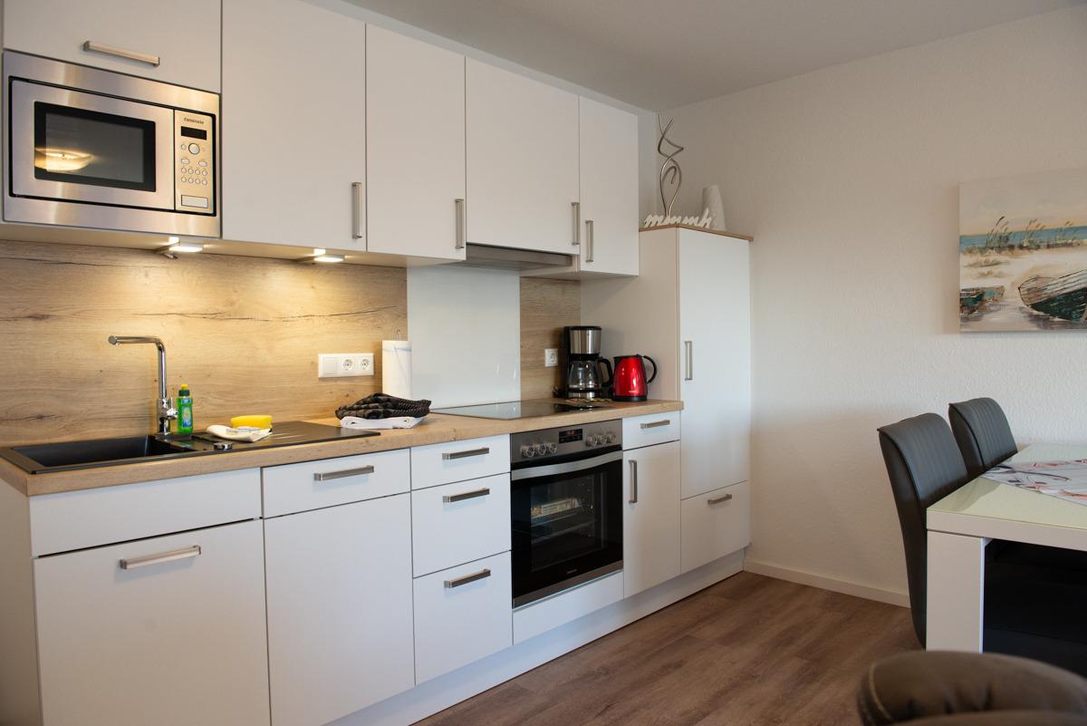 Die Einbauküche verfügt über ein Cerankochfeld mit Backofen sowie eine Mikrowelle und ist mit kompl. Geschirr ausgestattet.