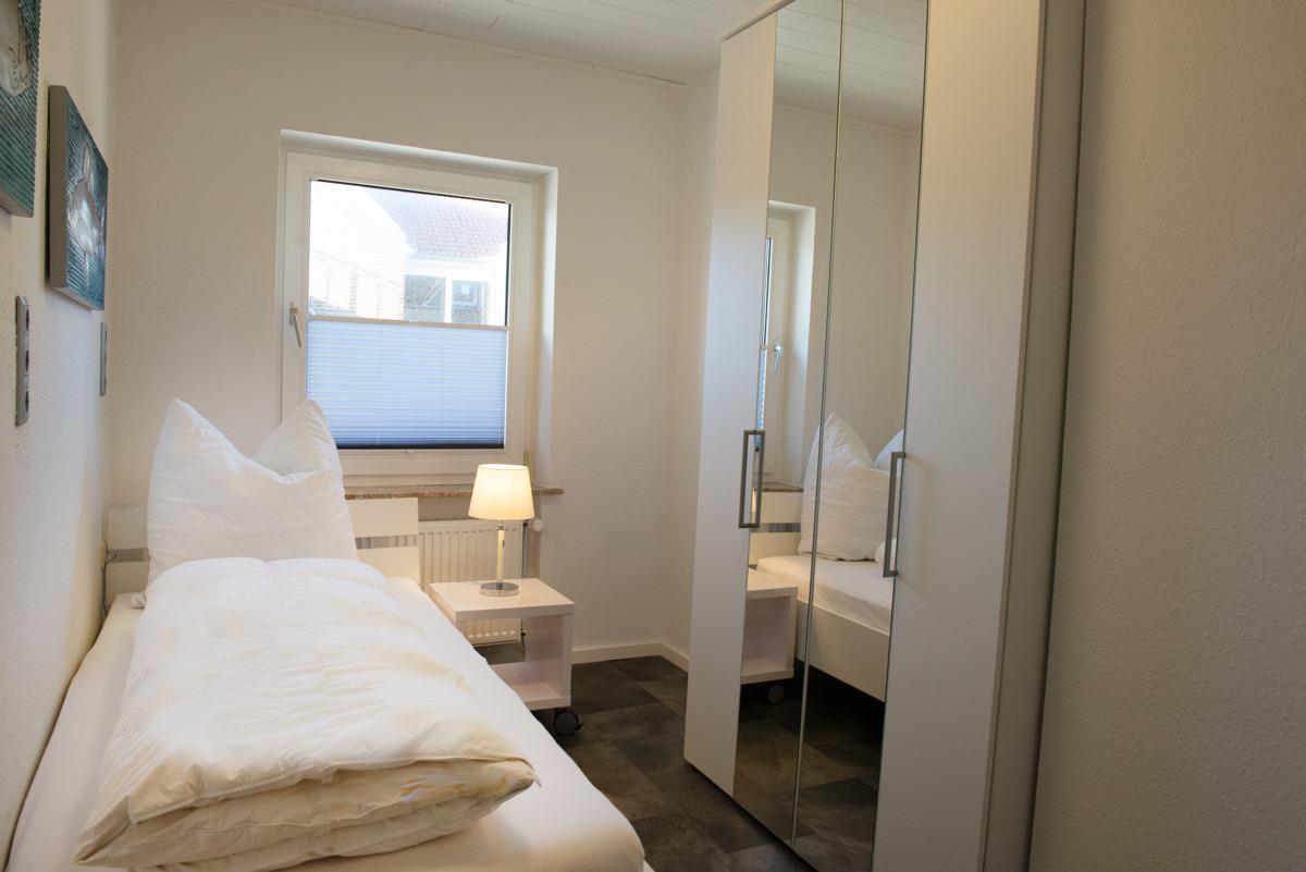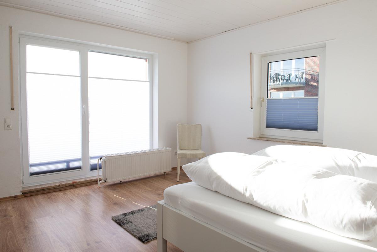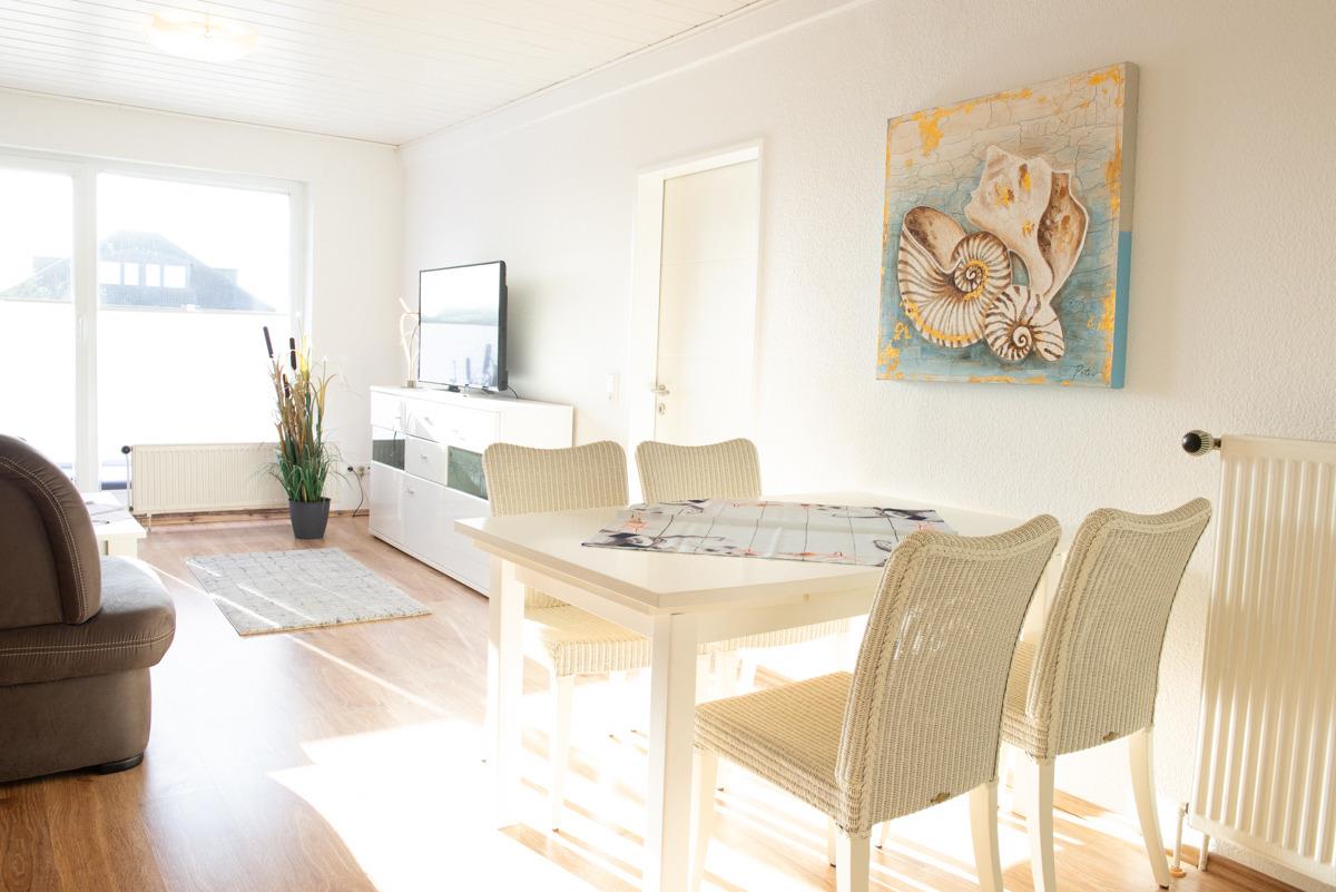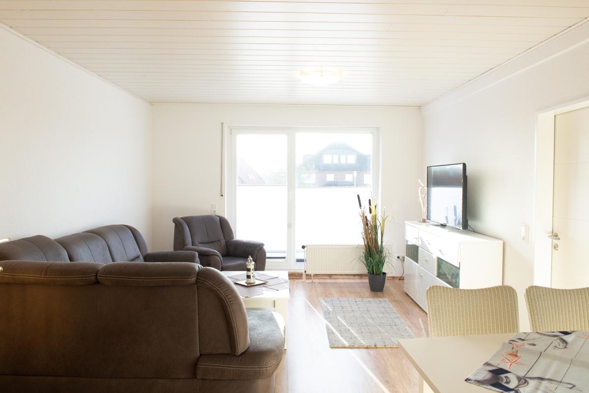 Diese komfortable Ferienwohnung im 1. OG für 2-3 Personen liegt in TOP Lage. Das Wohn-Esszimmer mit voll ausgestatteter intergr. Einbauküche , einer gemütlichen Couch, einem HD Fernseher und einer Essgruppe laden zum Wohlfühlen ein. Von dort aus gelangen Sie auf den langen möblierten Sonnenbalkon mit Blick zur Norddeicherstr., der auch vom Schlafzimmer zu erreichen ist. Das Bad mit Dusche u. WC ist hell und freundlich und verfügt über einen Hocker und einen Föhn. Außerdem befinden sich in der Wohnung 2 Schlafzimmer, im großen Schlafzimmer mit Fernseher und Außenrolladen und dem Zugang zum Balkon, im kleinen Schlafzimmer mit Verdunklungsplissees + Außenjalousien.