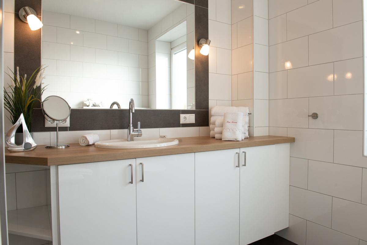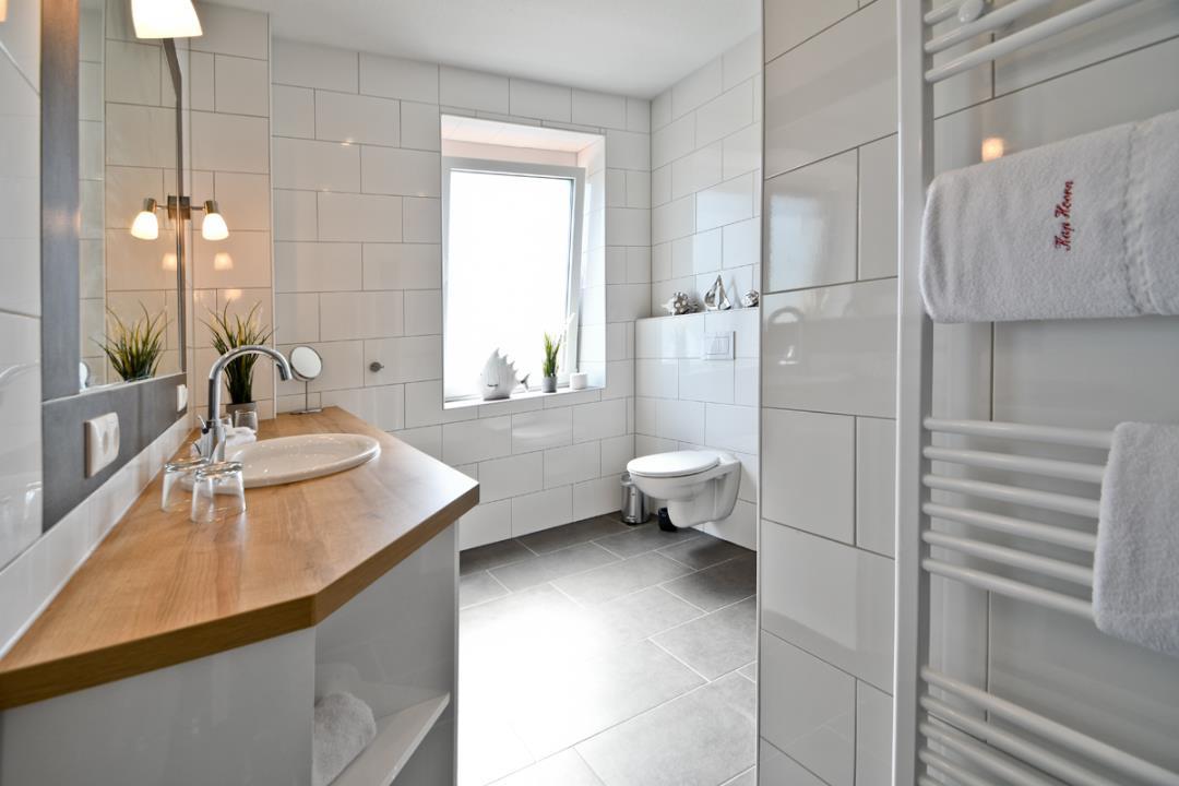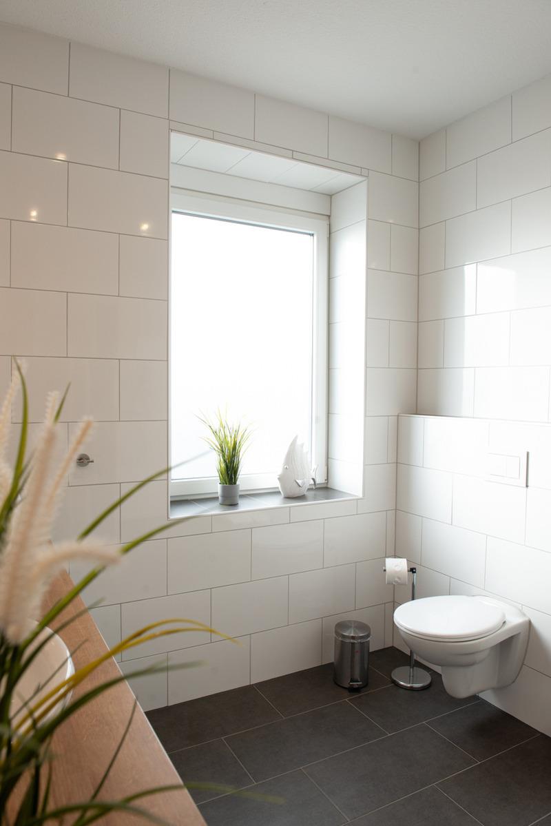 Das großzügige moderne Bad/WC mit Fenster hat eine bodenebene Dusche, ein Hänge-WC und eine Waschtischkombination mit Spiegel, einen Föhn und einen Kosmetikspiegel.