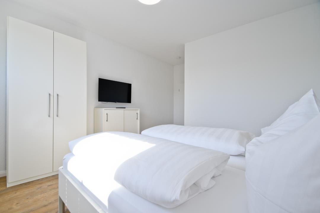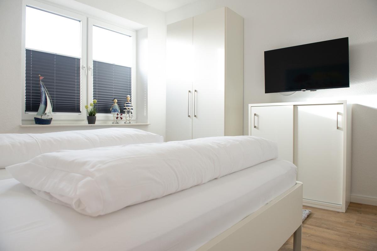 Das Schlafzimmer ist mit einem Doppelbett und Fernseher ausgestattet.