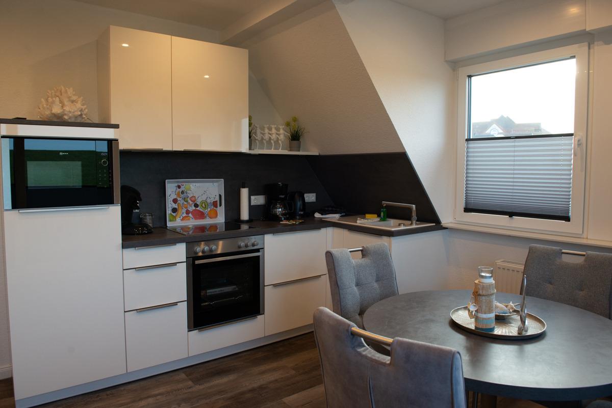 Die Ferienwohnung "Deichhöhe VO" für 2 Personen befindet sich im 1. OG eines neu erbauten Ferienhauses mit insges. 4 Wohnungen. Die Wohnung liegt in einer TOP Lage mit einem direkten Blick zum Deich. Das Wohn-Esszimmer ist mit einer gemütlichen Couch, 2 Sessel, einer Essgruppe, einem Fernseher und einer integrierten Einbauküche ausgestattet-von dort aus gelangen Sie auf die möblierte überdachte Dachloggia. Das Schlafzimmer ist mit einem Doppelbett, Fernseher, Aussenrolläden und Verdunklungsplissees ausgestattet. Das moderne Bad mit Fenster verfügt über eine bodenebene Dusche, einem WC, einer Waschtischkombination mit großem Spiegel, einem Föhn und einem Hocker.