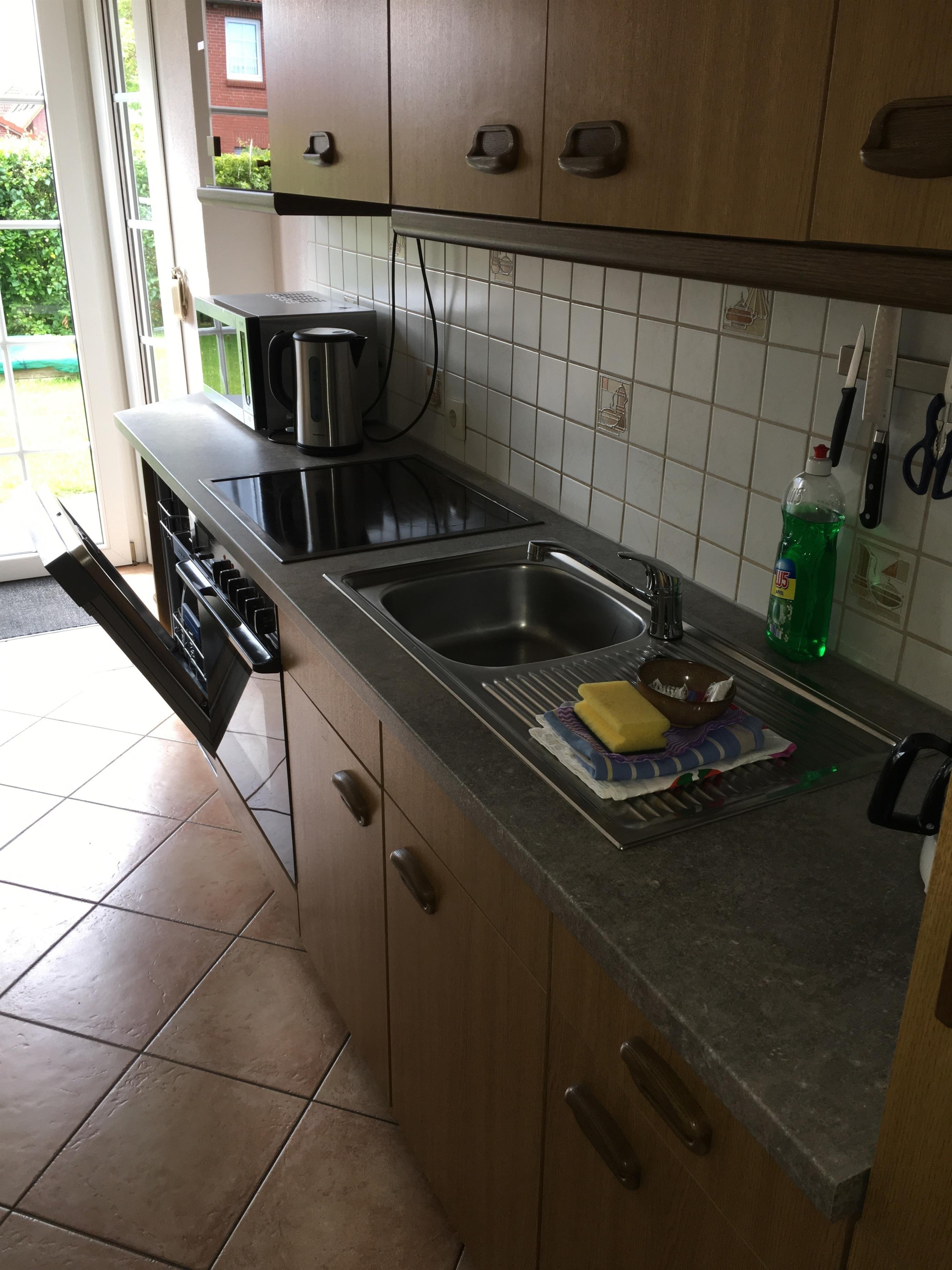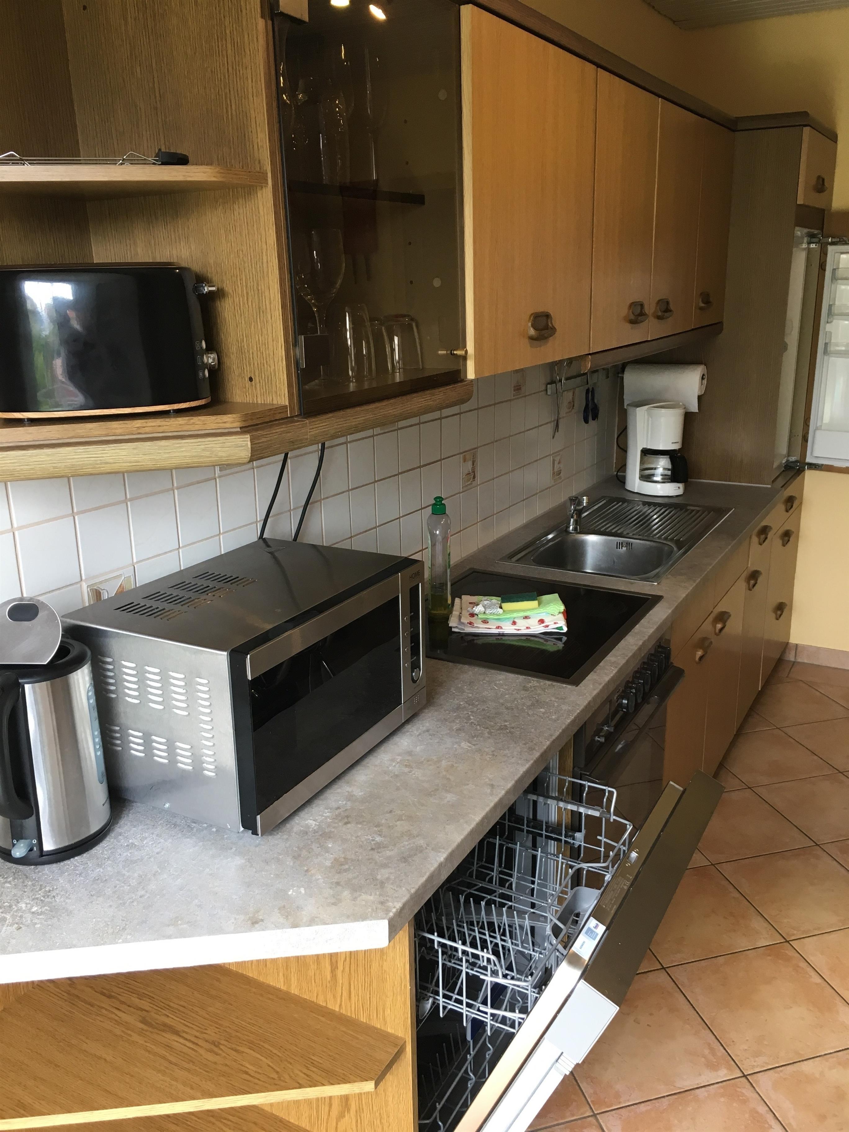 Die Küche verfügt über Geschirrspüler, Mikrowelle, Kaffeemaschine, Wasserkocher, Herd, Backofen, Kühl- und Gefrier-Kombination.