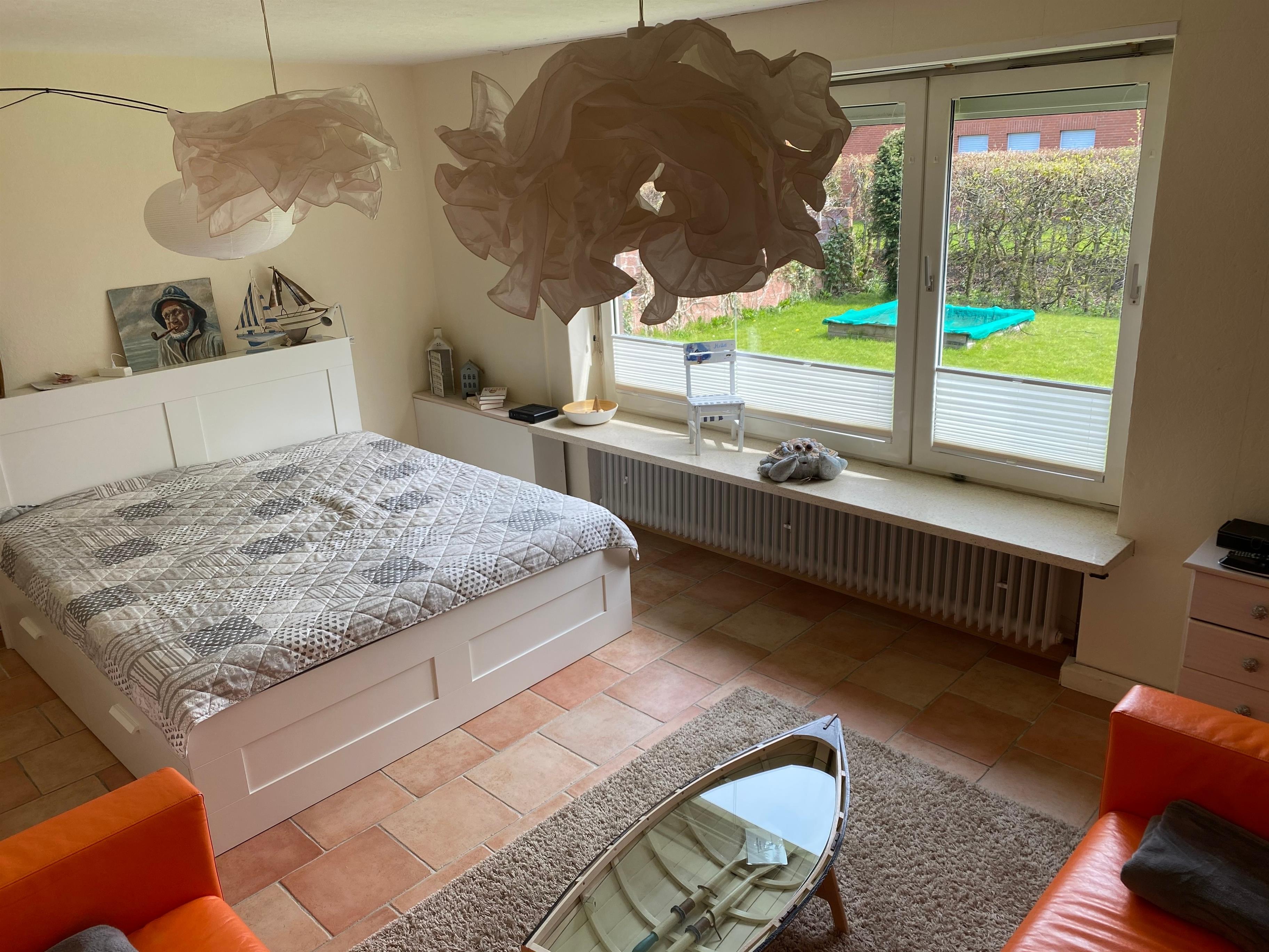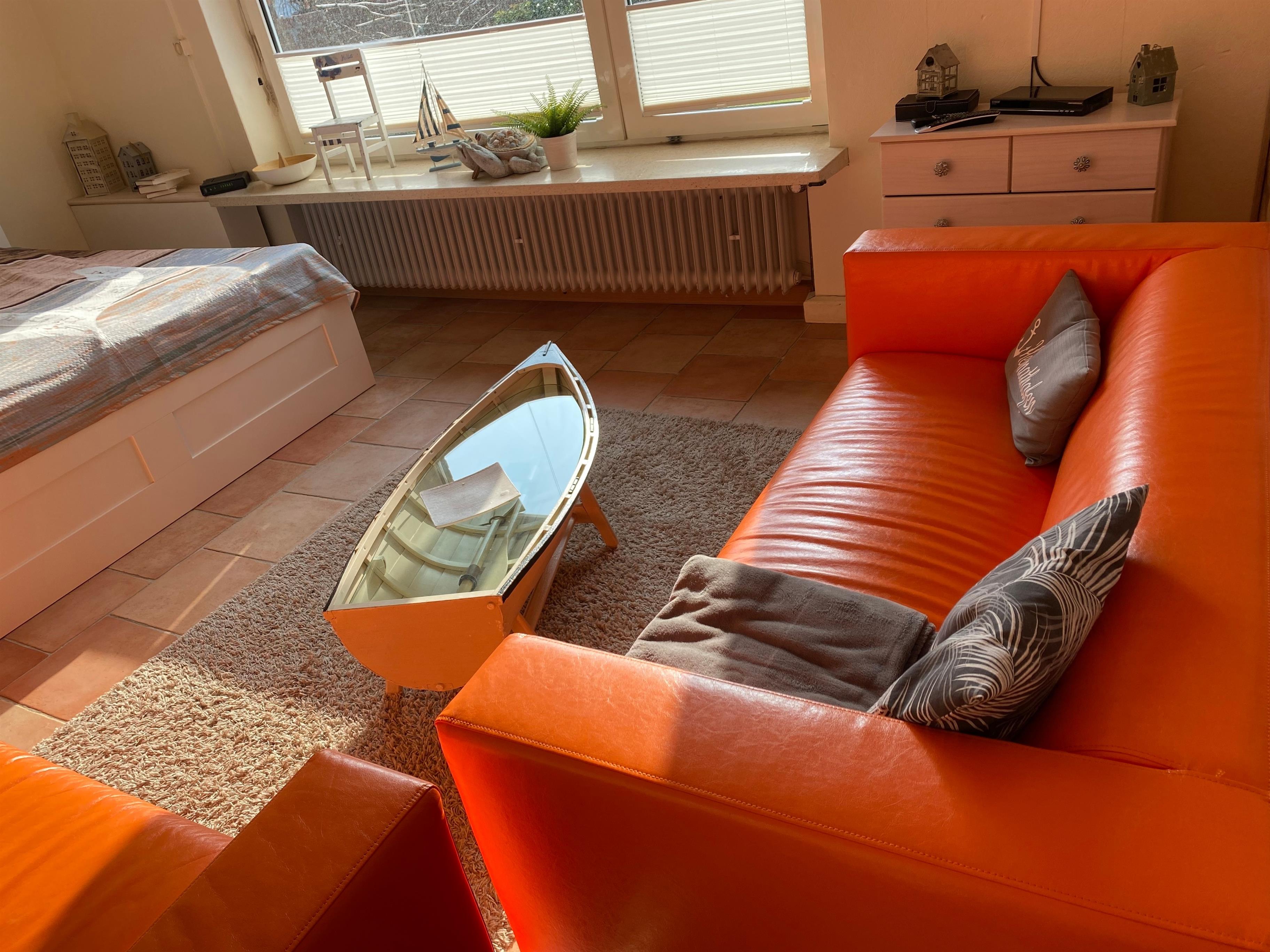Im Wohn-/Schlafzimmer eine gemütliche Sitzecke und ein Doppelbett (180x200).